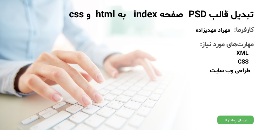 تبديل قالب PSD صفحه index (يک صفحه) به html و css بطوريکه فايل CSS و html توليد شده بايد تا حد امکان سبک و سريع و منطبق بر استانداردهاي W3 باشد و توسط validator هاي سايت w3.org بدون ايراد تاييد شود. ضمنا با همه مرورگرها از جمله IE6 سازگار باشد.