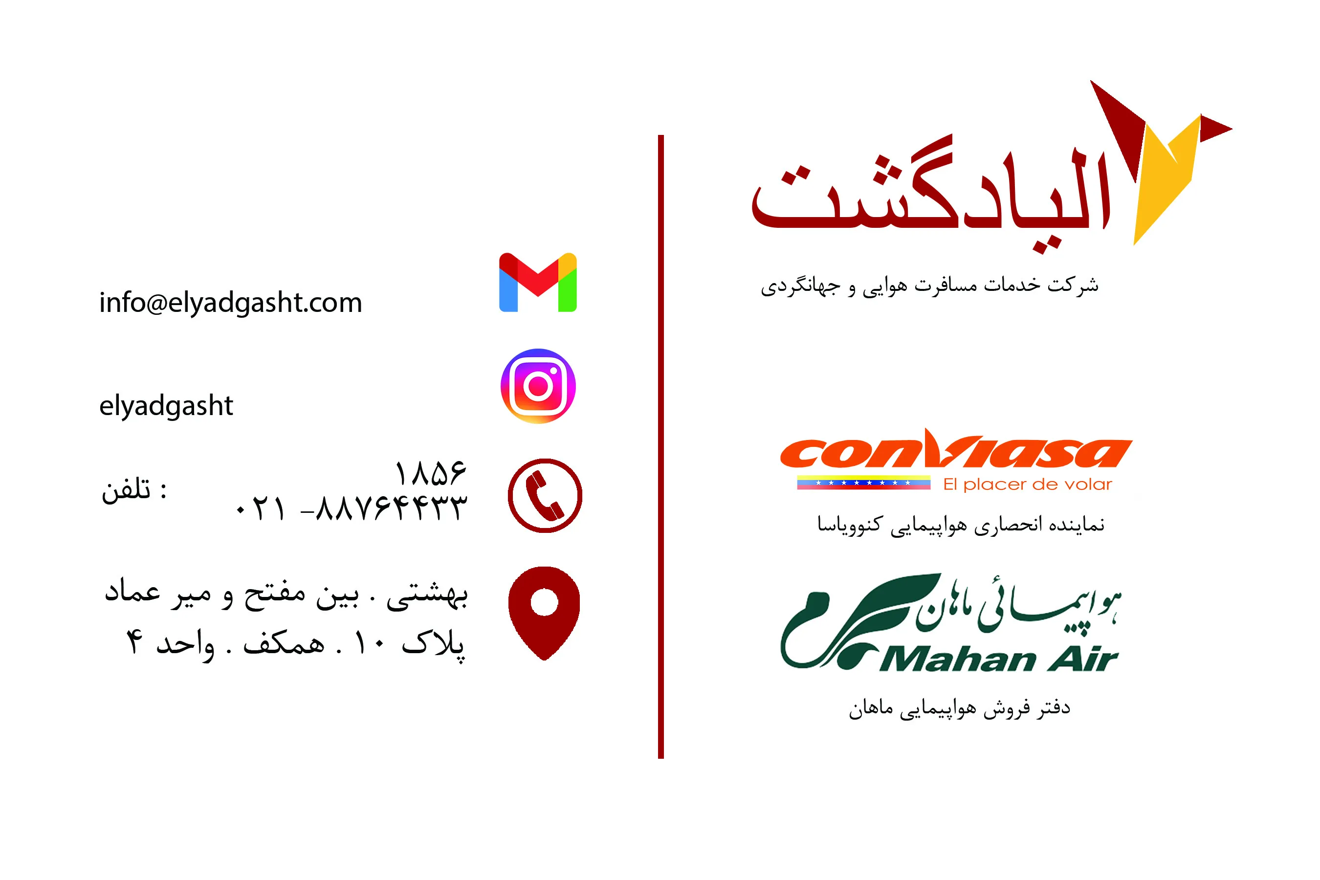 طراحی کارت ویزیت شرکت آژانس هواپیمایی الیادگشت دفتر فروش هواپیمایی ماهان