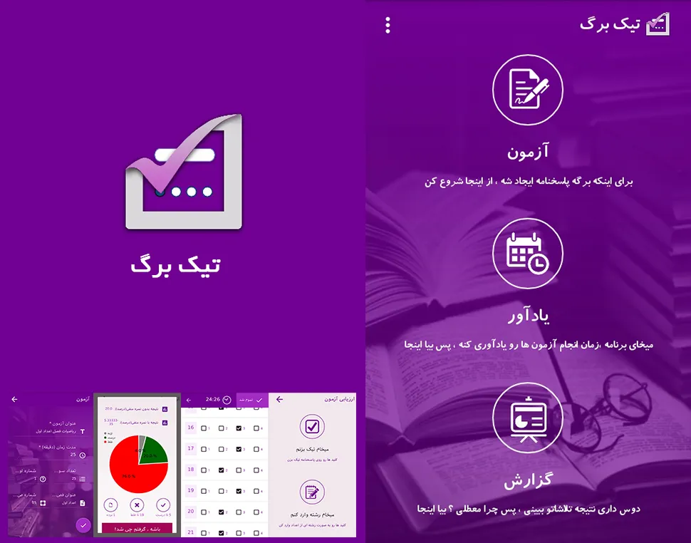 تیک برگ یک اپلیکیشن در حوزه آموزش و تست زنی می باشد . در واقع یک پاسخ نامه هوشمند است با قابلیت زمان بندی، تنظیم هشدار، تصحیح و محاسبه نمره آزمون .