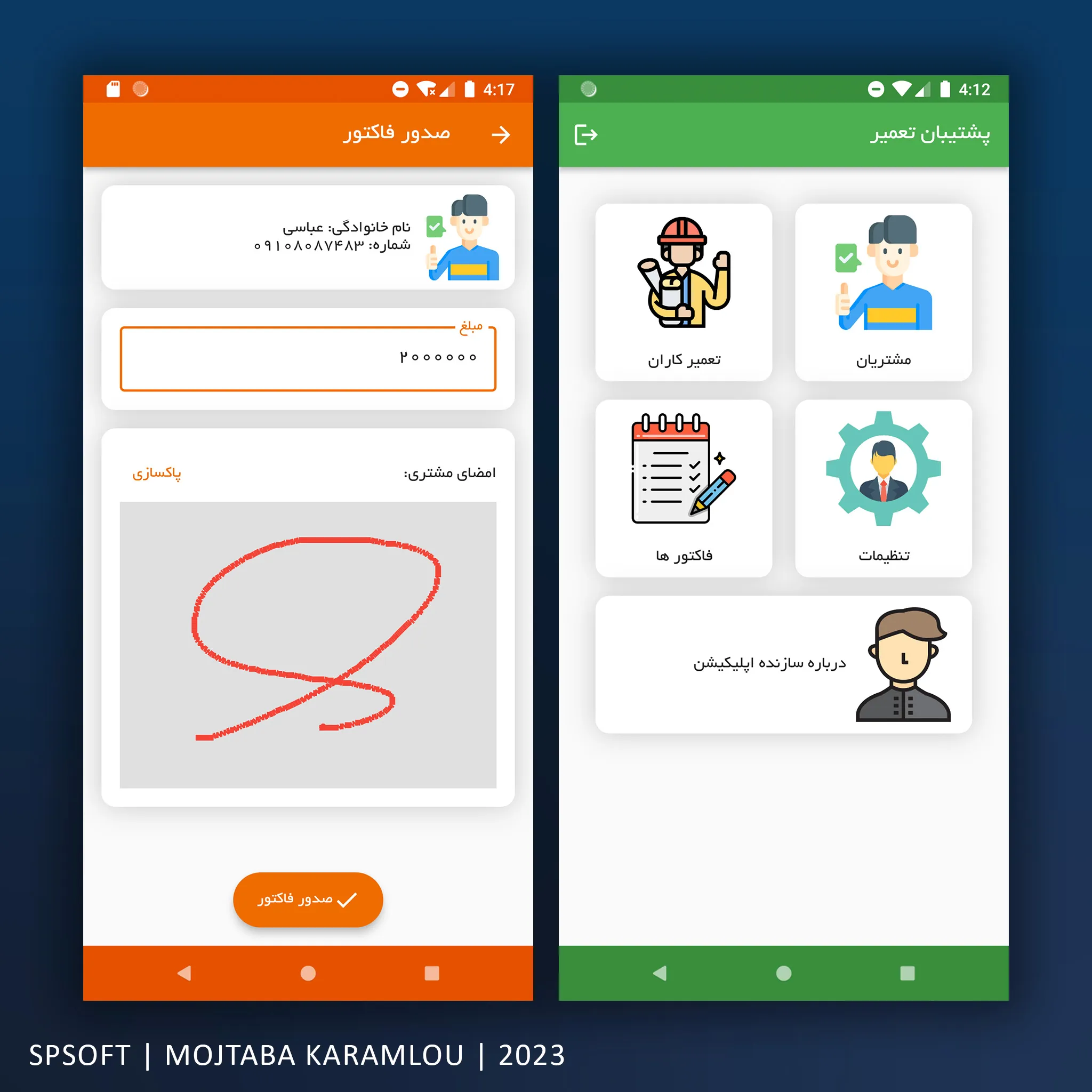 برای راحتی کار افراد این مجموعه زده شده توی این اپلیکیشن مدیر مجموعه مشتری هارو ثبت میکنه و به مشتری و تعمیرکار اطلاع داده میشه و بعد از پایان کار تعمیرکار پس از دریافت امضای الکترونیک فاکتور صادر میشه!