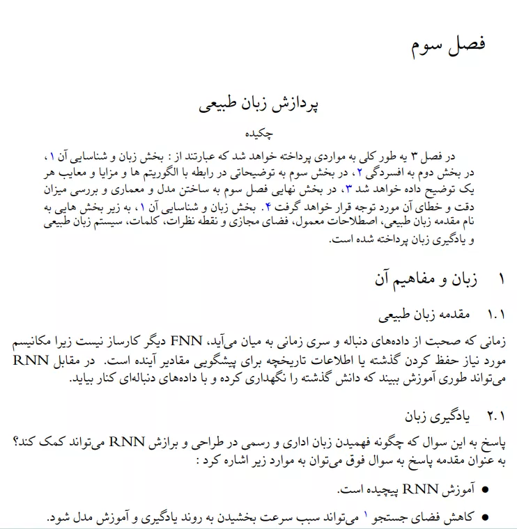 در تصویر خروجی فوق, نمایش تیتر, شماره فصل, چکیده فصل, تقسیم بندی بخش, تقسیمبندی زیر بخش و نوشتن آیتم را به صورت pdf قابل نمایش است.