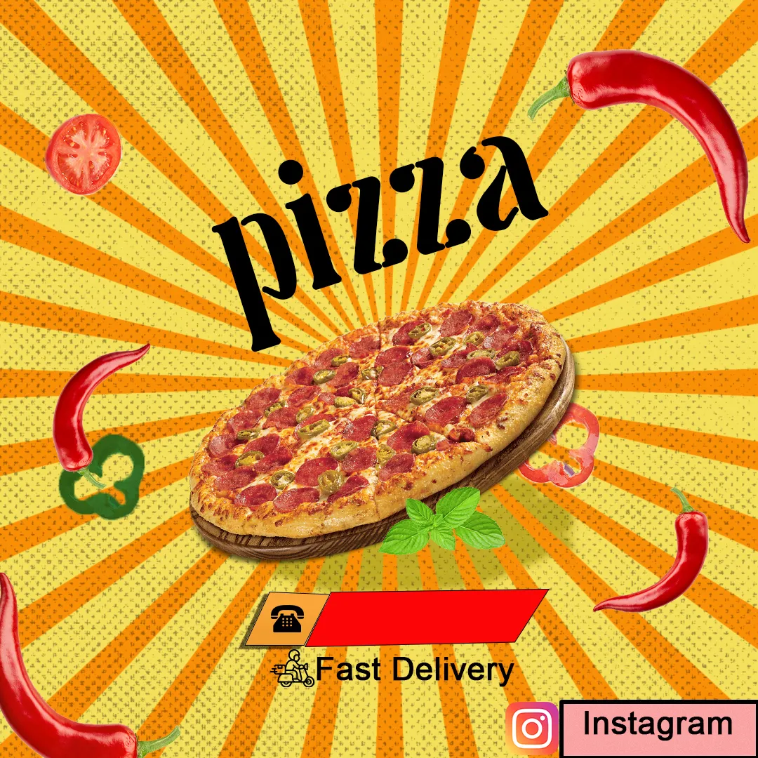 یک نمونه طراحی پست تبلیغاتی پیتزا مختص رستوران ها و اغذیه فروشی ها. پس زمینه، عکس های جانبی و همچنین عکس محصول به انتخاب شما میتونه متغیر باشه.