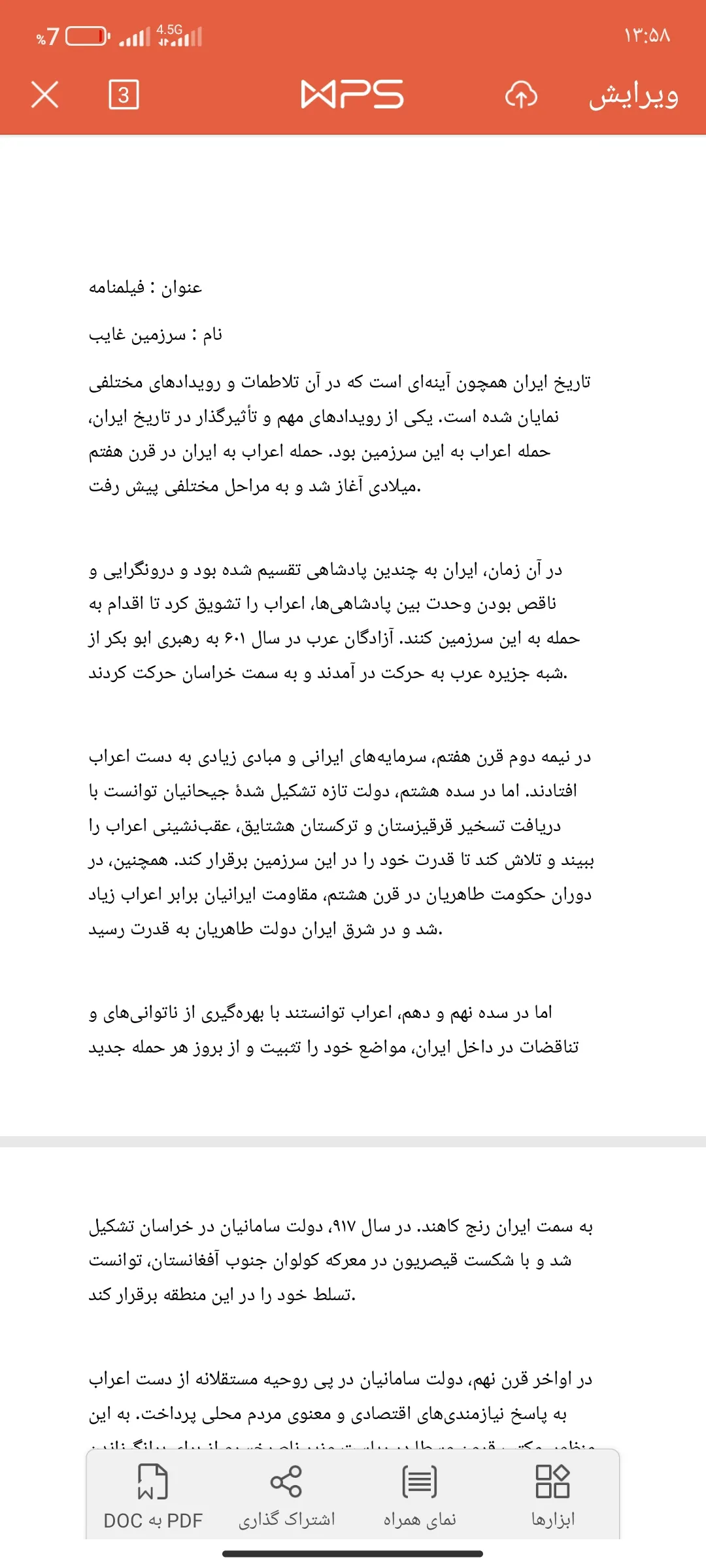 در این نمونه کار من یک فیلمنامه تهیه کردم درباره حمله اعراب به ایران که 1000 کلمه است و بخشی از اونو به صورت عکس آپلود کردم