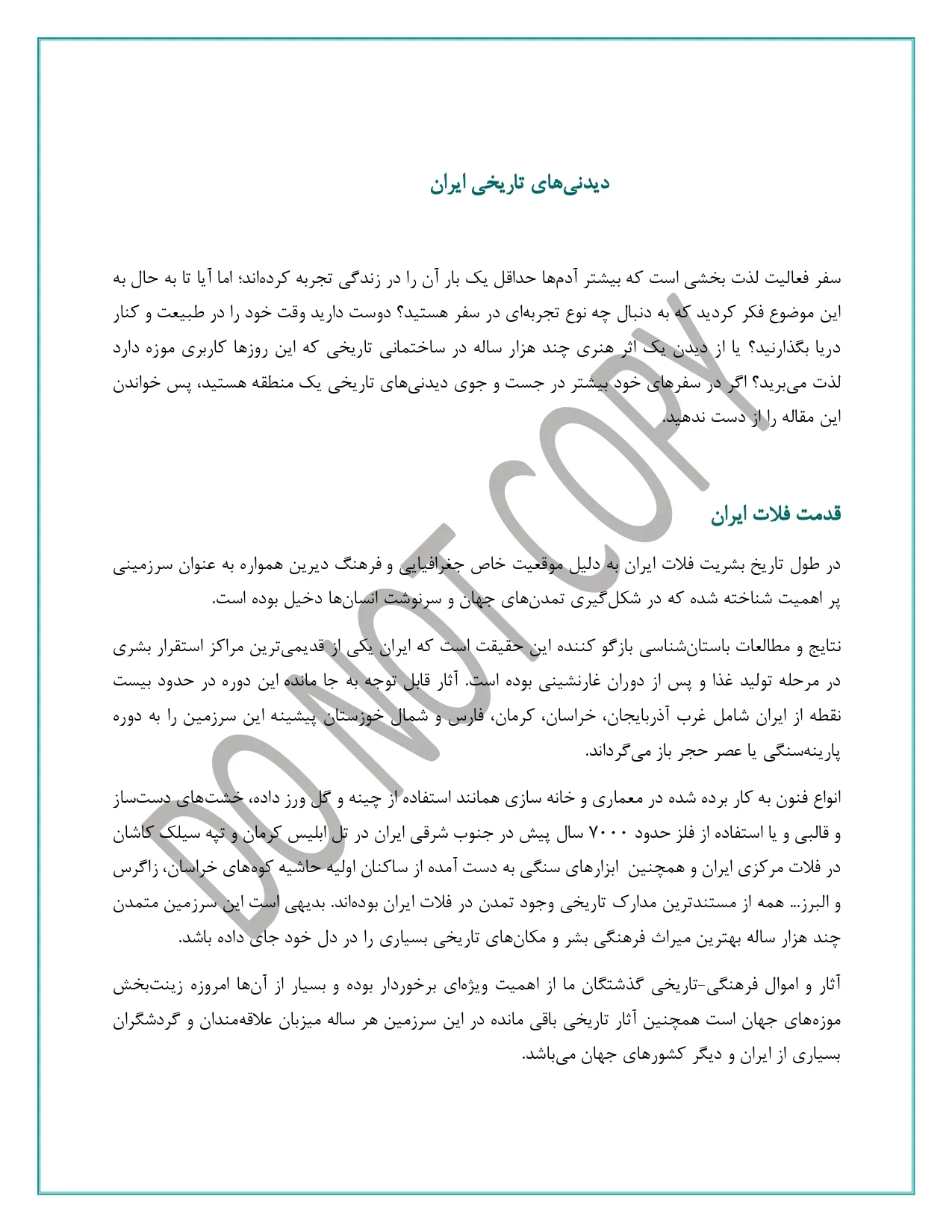 مقاله بالا تحقیقی راجع به دیدنی های تاریخی ایران است. با توجه به زمینه اطلاعاتی که در حوزه تاریخ دارم ابتدا با نوشتن مقده و تشویق خواننده به پیشینه تاریخی ایران پرداخته شده و بعد از آن در گروه بندی ههای مشخص و جذاب دیدنی های تارخی ایران معرفی شده