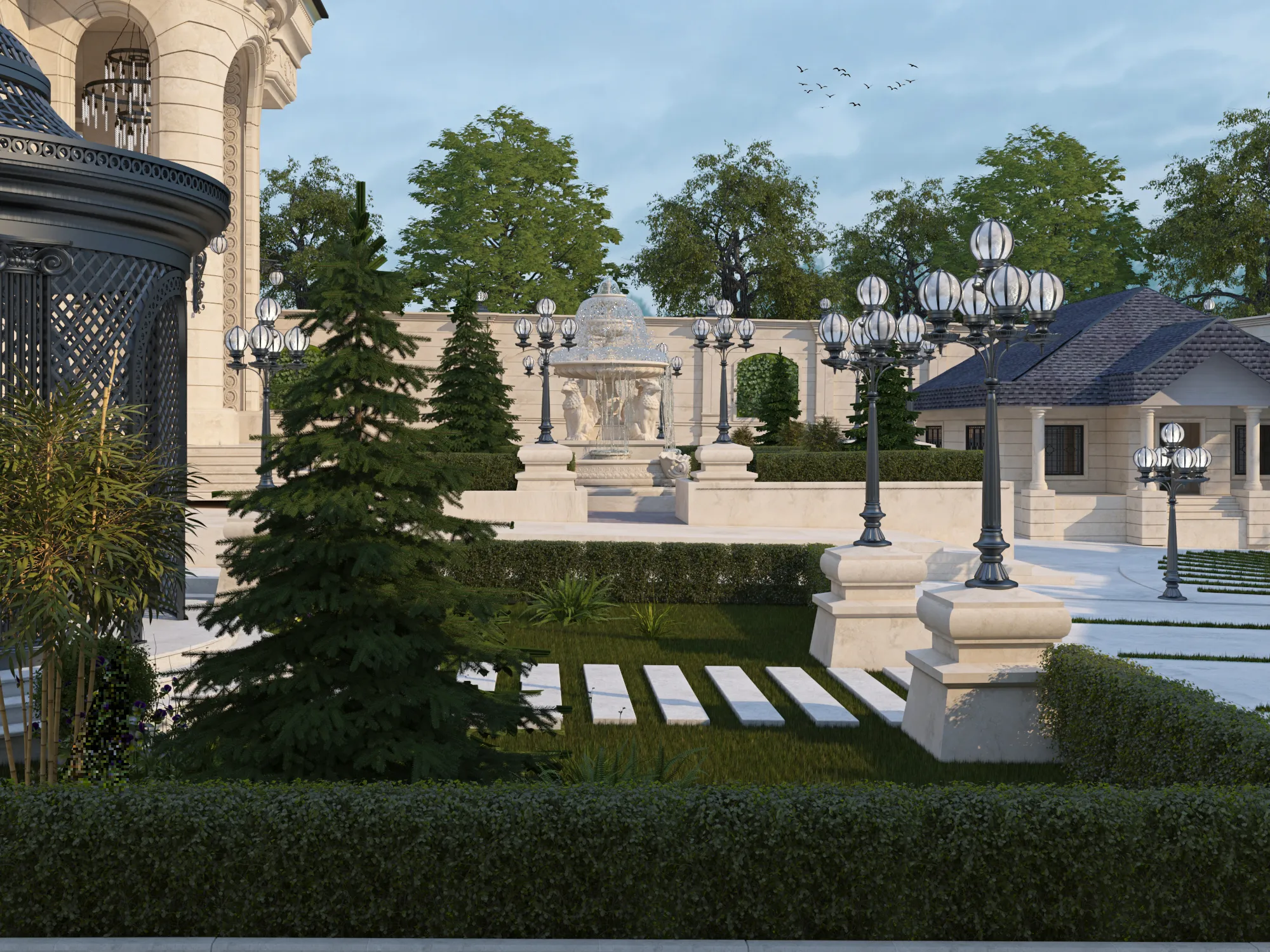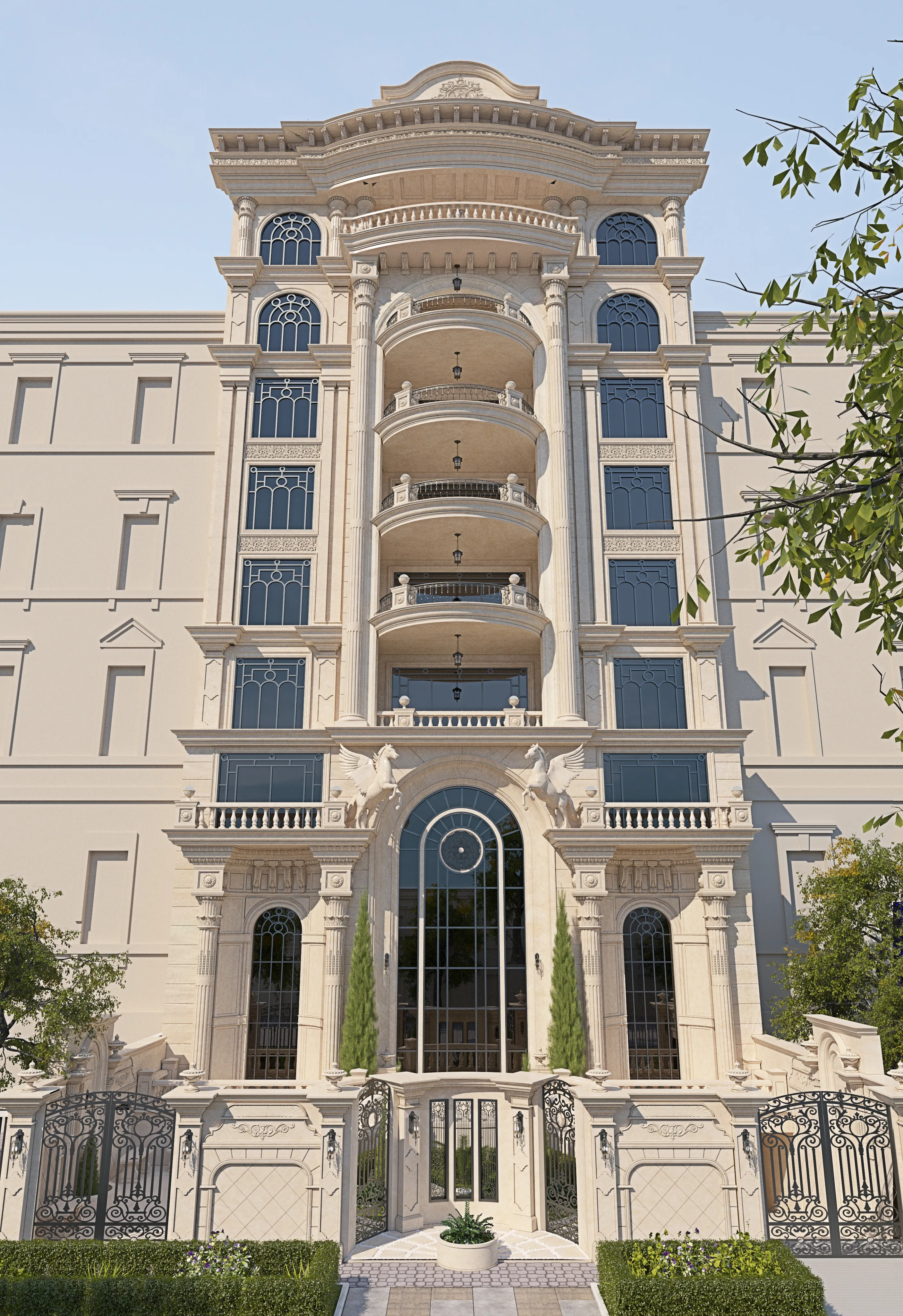 سه بعدی سازی و رندر خارجی نمای مسکونی و نمای ویلا که به سبک کلاسیک طراحی شده است