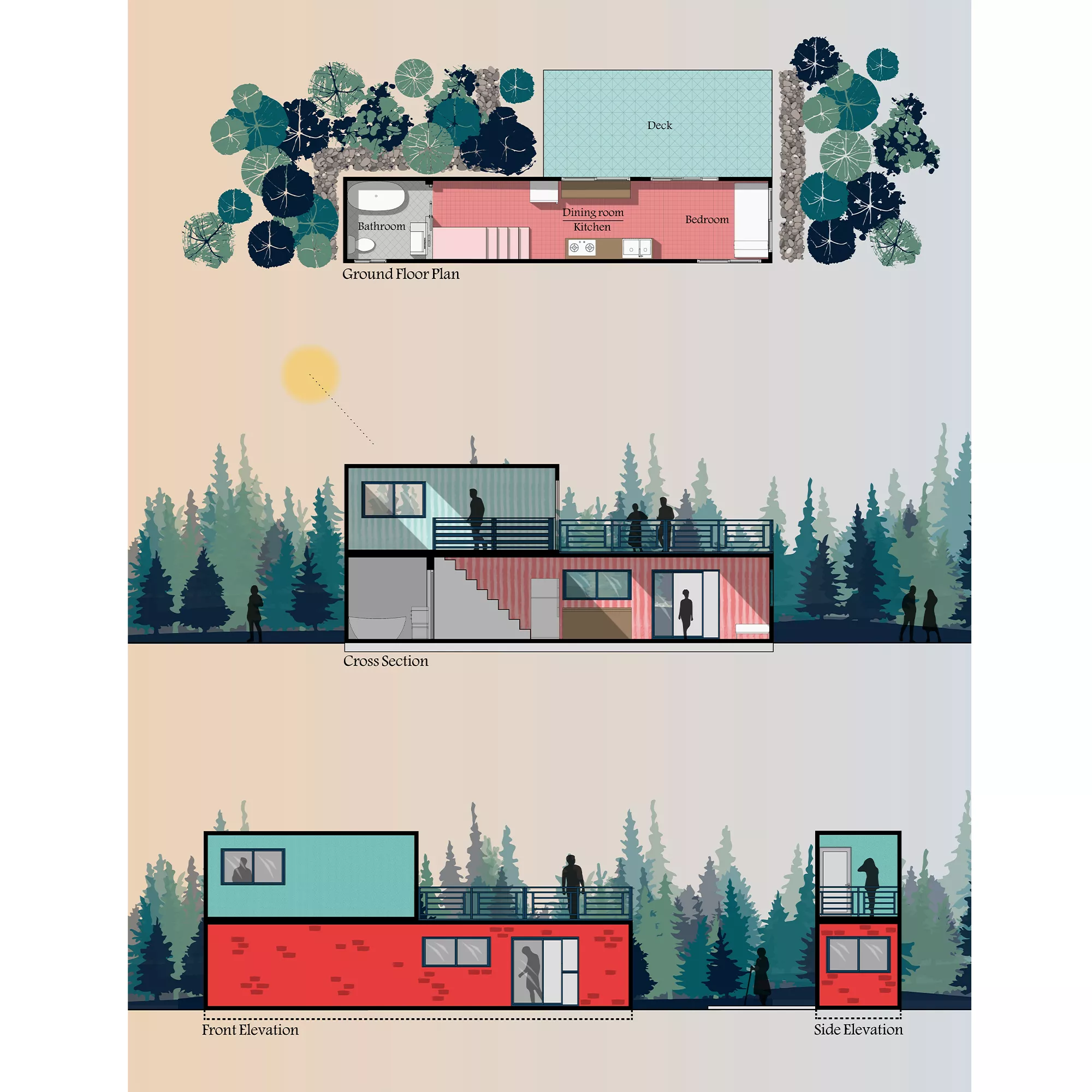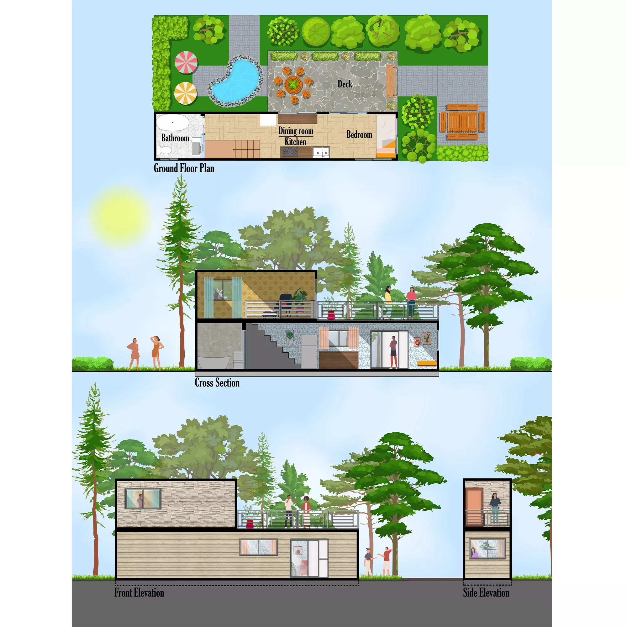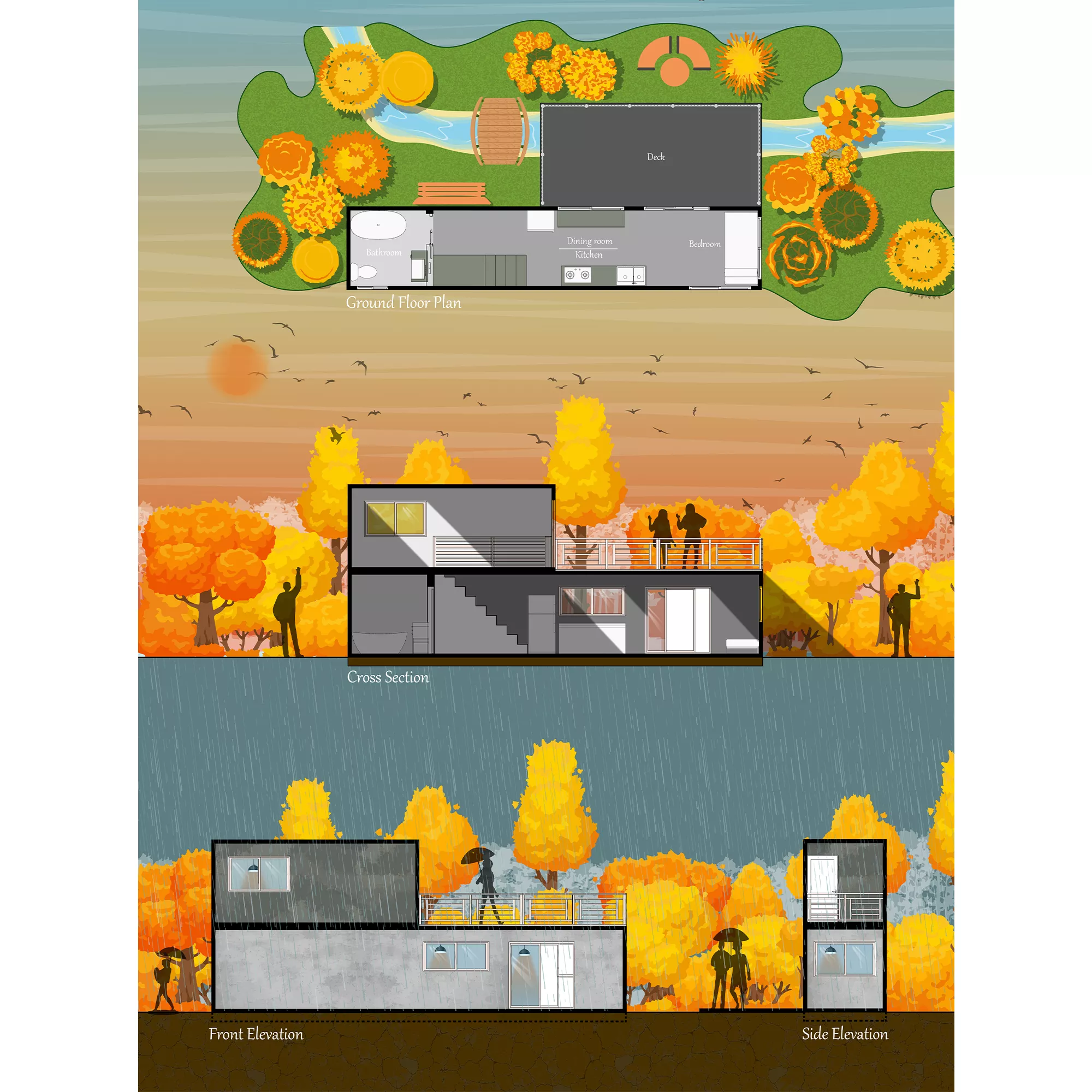 شیت بندی گرافیکی و پست پرو پروژه معماری شامل دو نما و یک پلان