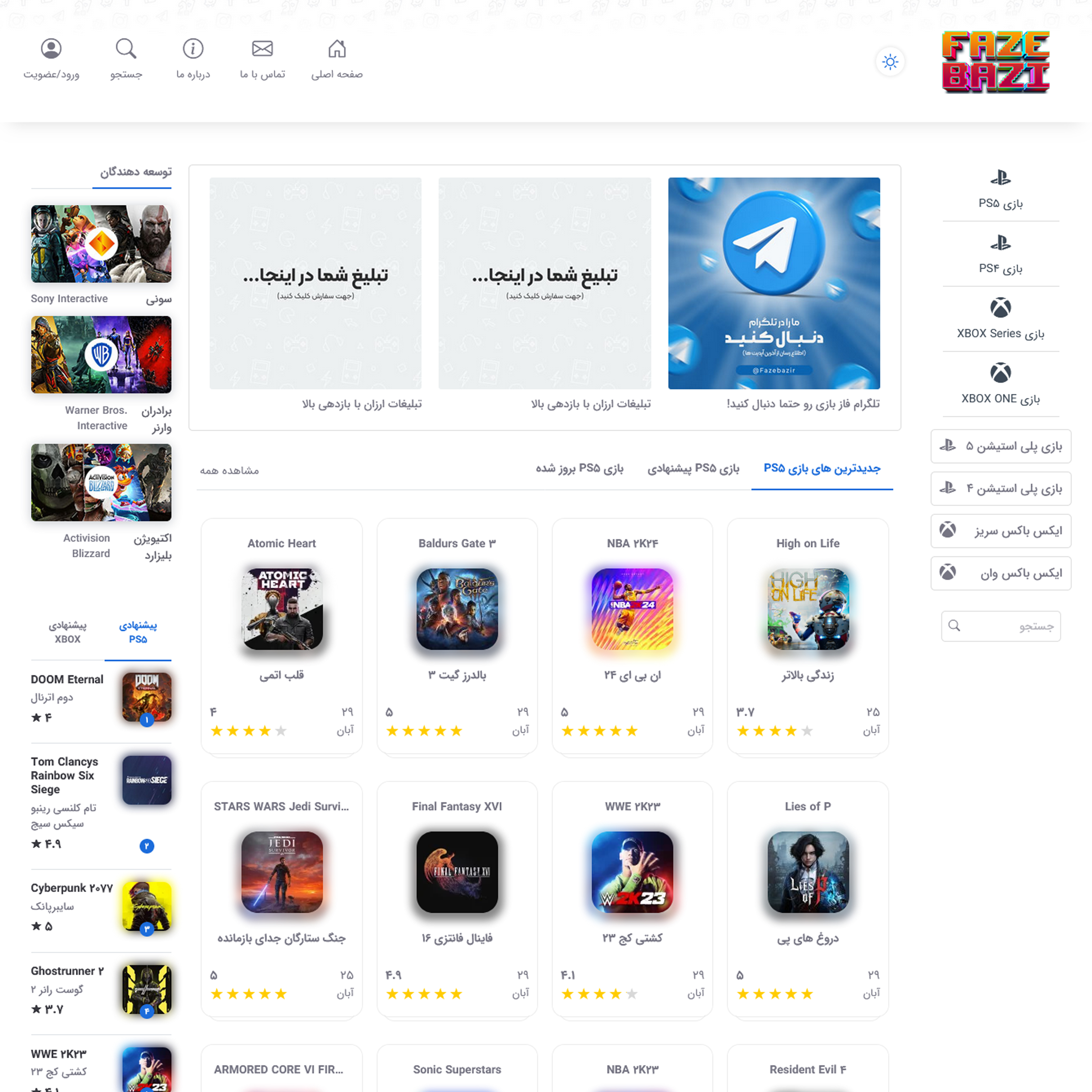 فاز بازی با قالبی به شکل قالب بازی های موبایل اما برای کنسول های ps4 - ps5 و ... راه اندازی شده است. بخش ویژه لینک های دانلود در پست و بخش مدیریت، بخش گزارش خرابی لینک و فایل و پسورد فایل ها از مزیت ایت سایت است.