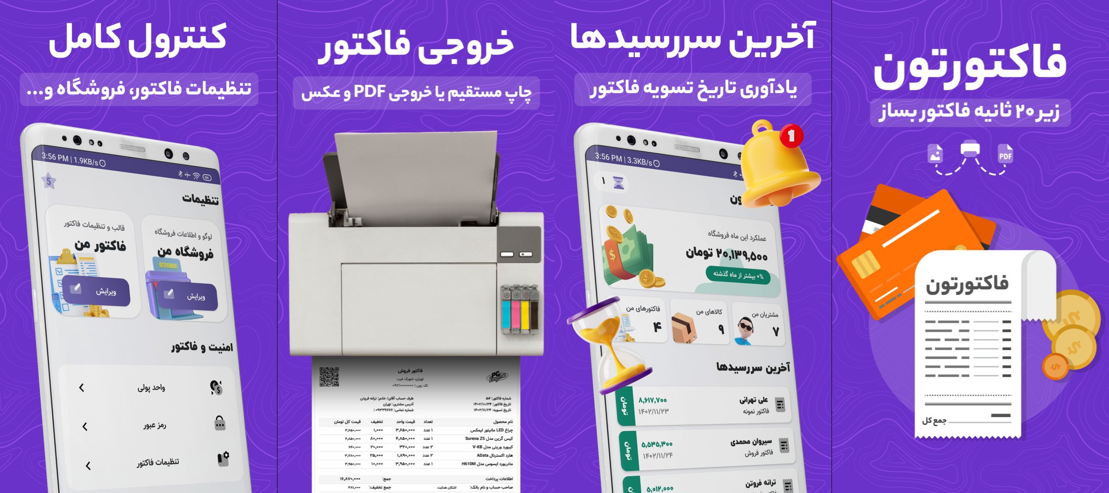نرم افزار صدور فاکتور فروش رایگان - فاکتور آنلاین - برنامه فاكتور: فاکتورتون یک اپلیکیشن قدرتمند است که به شما کمک میکند تا به راحتی فاکتورها را ایجاد و مدیریت کنید و گزارشهای جامعی از عملکرد کسب و کار خود داشته باشید. با استفاده از این اپلیکیشن، شما قادر خواهید بود تا فاکتورهای خود را به سرعت و به صورت دقیق ایجاد کرده و ارسال نمایید.