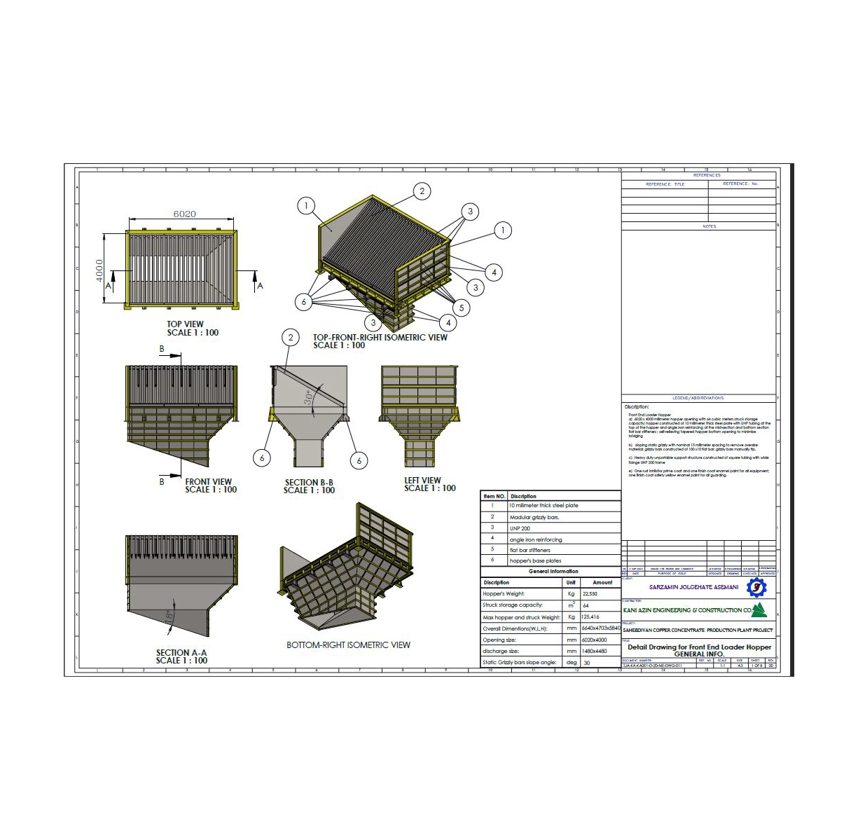 صفحه ای از نقشه های جزئیات ساخت Front End Loader hopper ترسیم شده مطابق نظر کارفرما