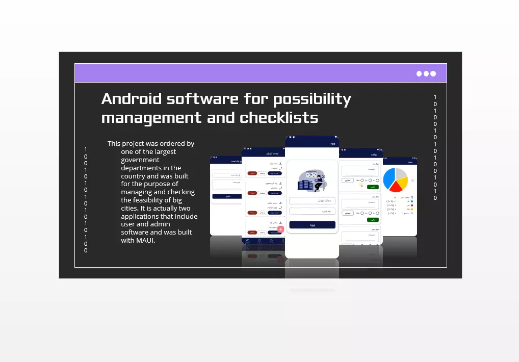 در ساخت این نرم افزار و وب سایتها از طیف وسیعی از تکنولوژی ها همچون android native, maui, blazor, xamarine استفاده شده که بسته به نیاز مشتری انتخاب شده ان