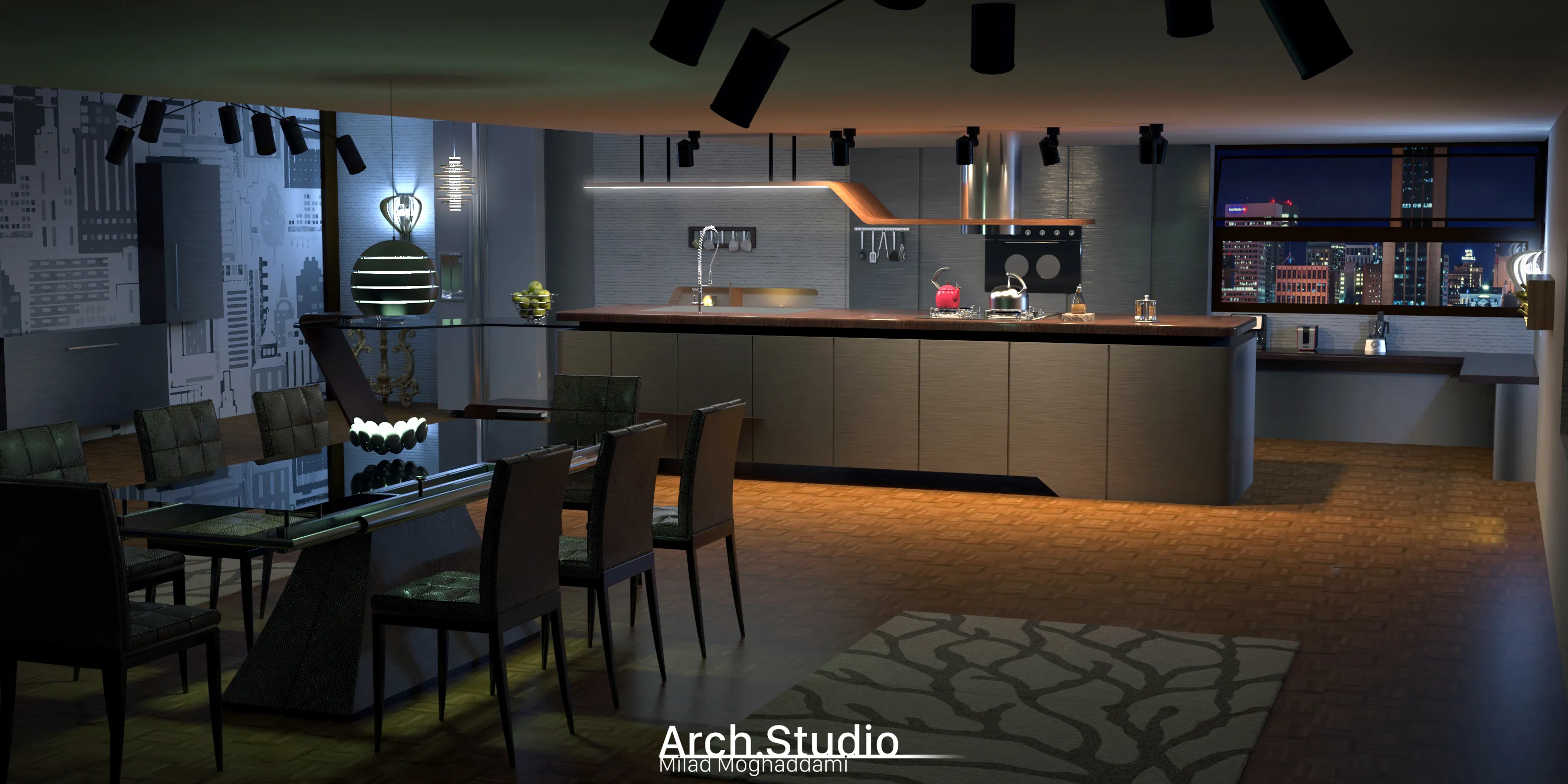 نمای شب از آشپزخانه ی مدرن، تمامی نورپردازی ها، و همینطور مدلینگ و طراحی، و رندرینگ، توسط خودم انجام شده.