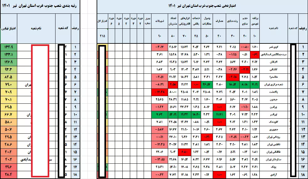 رتبه بندی شعب بر اساس شاخص های عملکردی آنها