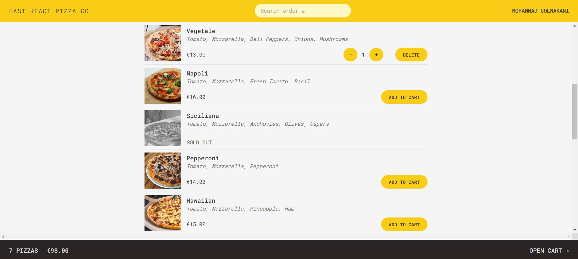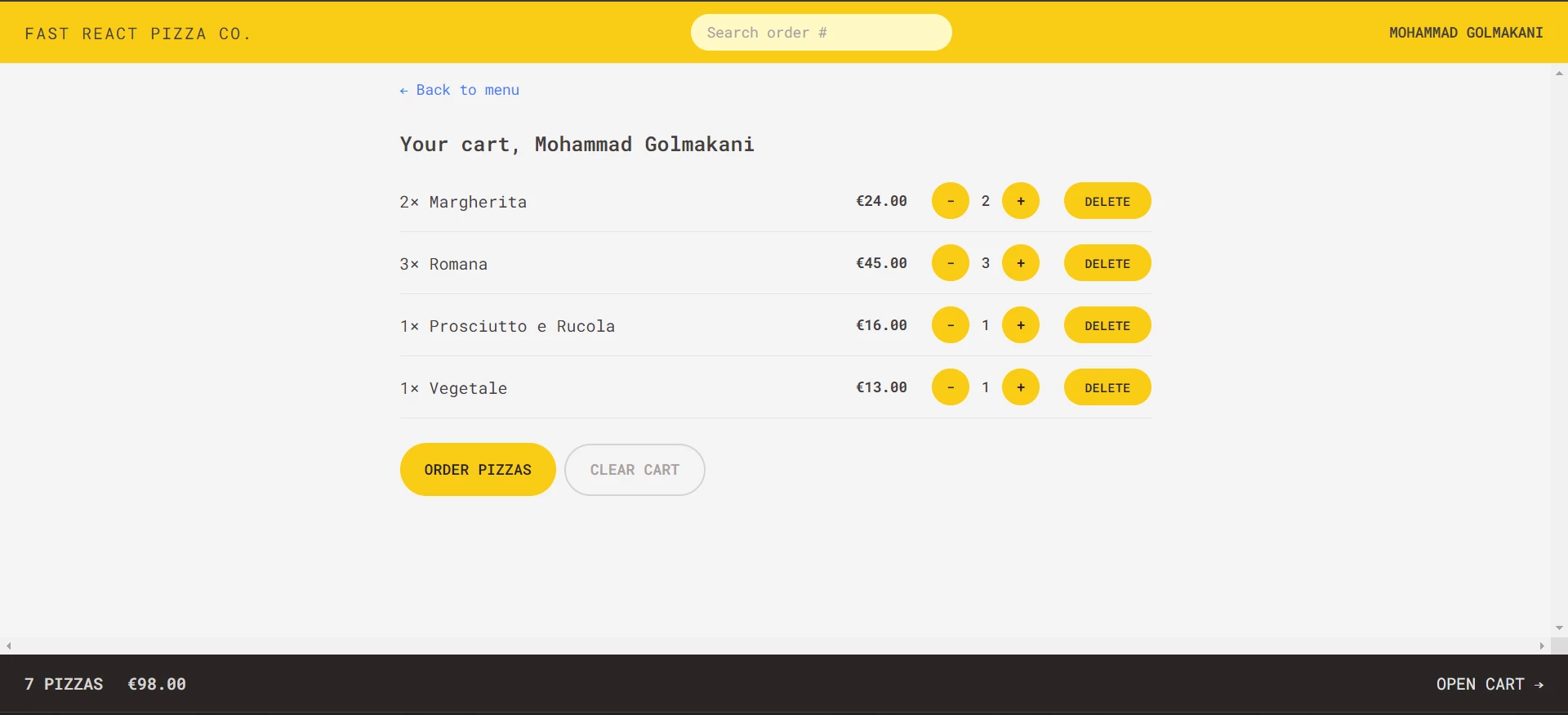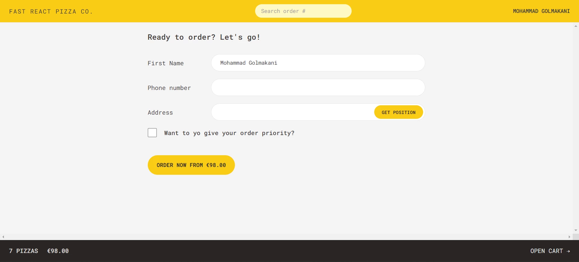 در اینپوت Your full name اسم رو ثبت میکنید تا وارد منو پیزا شوید، پیتزا رو انتخاب کرده و وارد سبد خرید میشوید، سپس تایید میکنید و شماره و آدرس را وارد میکنید تا سفارش ثبت شود.