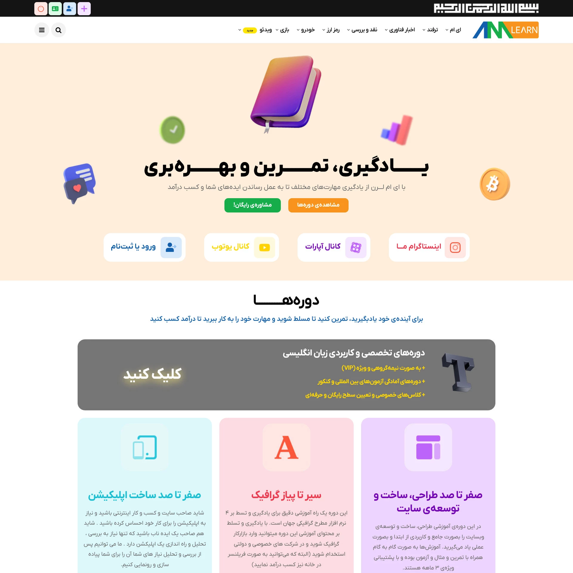 طراحی، توسعه و ساخت سایت ای ام لرن. دارای صفحات گوناگون و قابلیتهایی نظیر ثبتنام، ورود، خرید دوره، سیستم مدیریت آموزشگاه با امکانات شرکت در کلاس آنلاین، مشاهده کارنامه و...