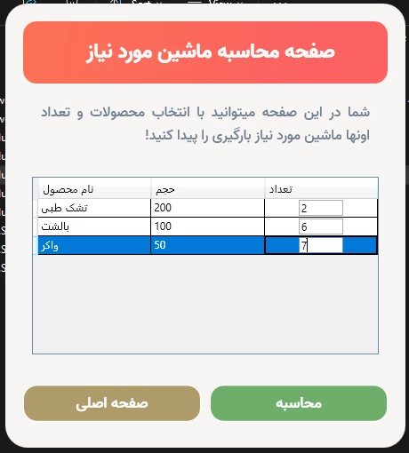 💠 نرمافزار شامل صفحه اصلی، صفحه افزودن، صفحه حذف محصول، صفحه افزودن ماشین های بارگیری، صفحه حذف ماشین های بارگیری و در نهایت صفحه محاسبه ماشین مورد نیاز برای بارگیری محصولات انتخاب شده توسط کاربر