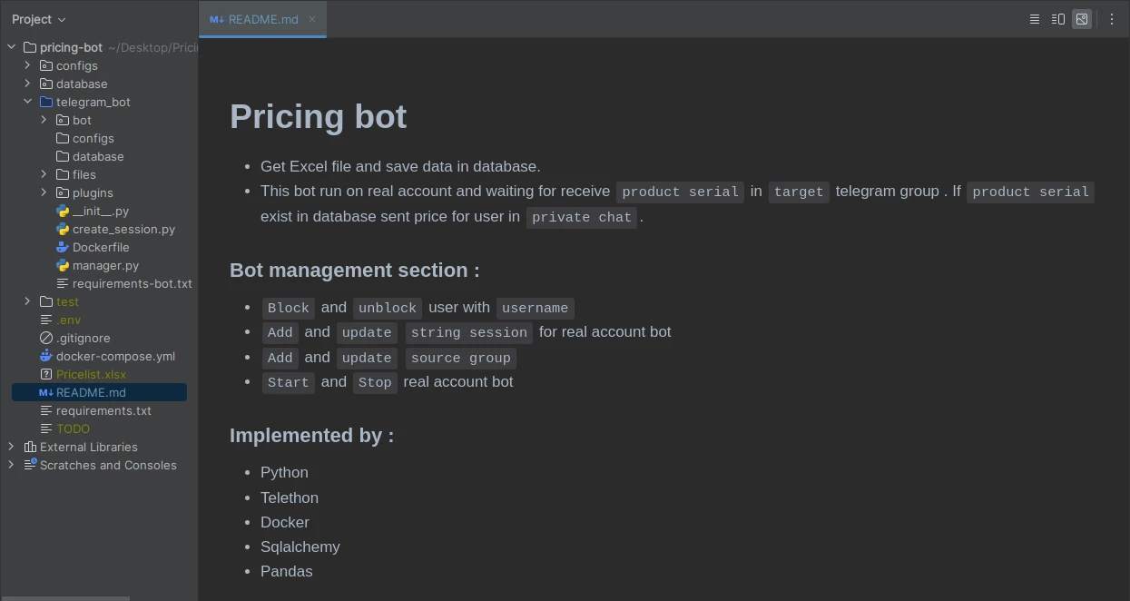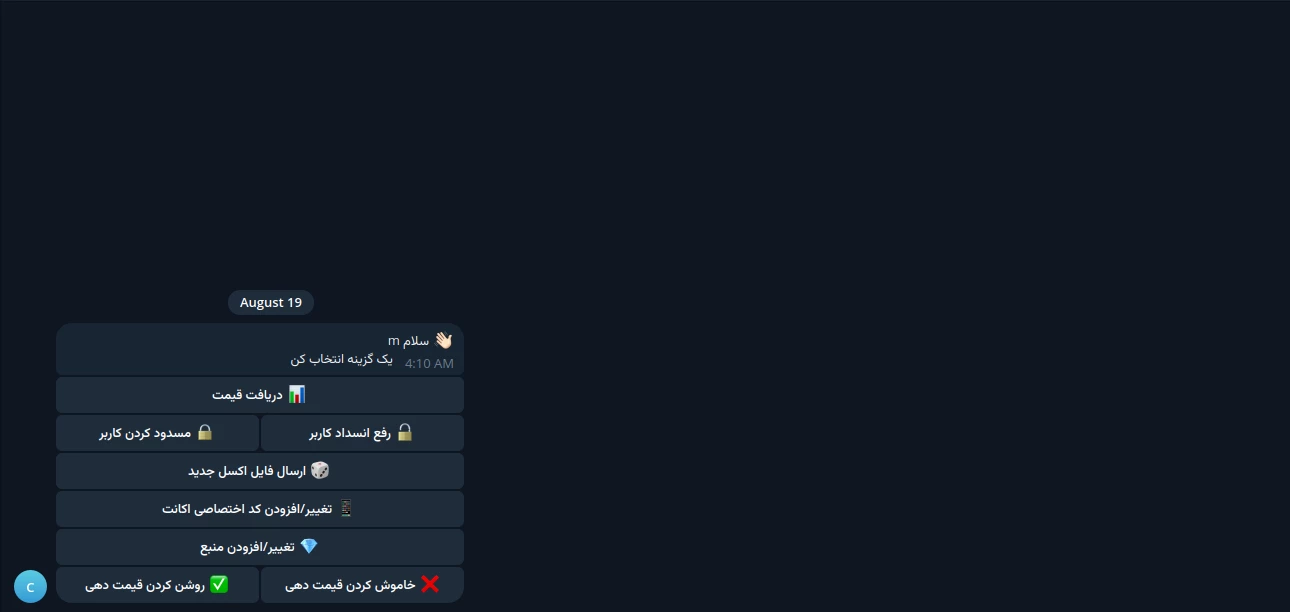 این ربات روی اکانت واقعی اجرا می شود و منتظر دریافت سریال محصول در گروه تلگرام هدف است. اگر سریال محصول در پایگاه داده وجود داشته باشد قیمت برای کاربر در چت خصوصی ارسال می شود.