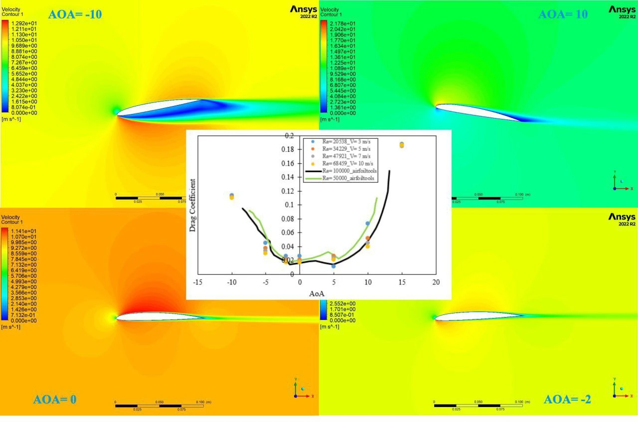 در این مطالعه ضریب درگ و کانتورهای سرعت با تغییر در زاویه حمله بررسی و با مقادیر تجربی مقایسه شد.