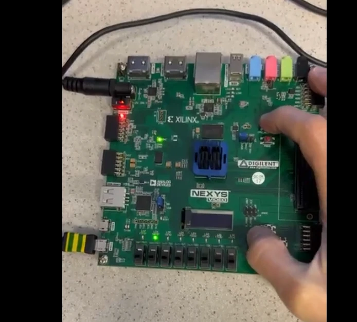 پیادهسازی بازی مشابه پینگ پونگ با استفاده از توصیف VHDL روی بورد Xilinx. دو دکمه فشاری برای هر بازیکن در نظر گرفته شده و توپ روی LEDها از چپ به راست (یا برعکس) حرکت میکنه. هر بازیکن وقتی توپ به سمتش میرسه باید دکمه رو فشار بده تا توپ به سمت مخالف برگرده. (شبیه پینگ پونگ)