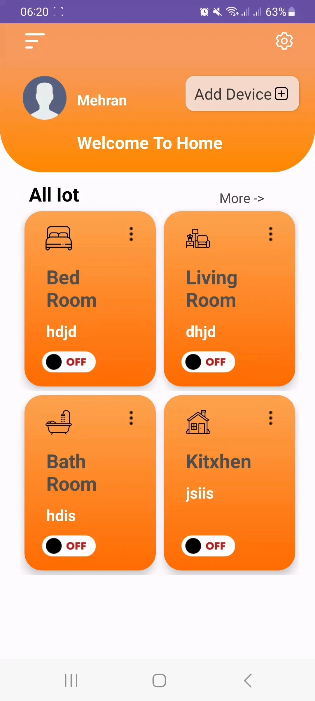 در این پروژه هدف این است که با وارد کردن ای پی ادرس دستگاه مورد نظر و تعریف اسم و محل ان دستگاه بتوان با api برایش درخواست on و off ارسال کرد که با توجه پارامتر ارسالی دستگاه خاموش یا روشن بشود.در این برنامه طراحی شخصی توسط خودم صورت گرفته که با استفاده از xml و کد های کاتلین پیاده شده و برای api از retrofit برای ارسال درخواست های GET و POST و برگشتن جواب ان استفاده شده است