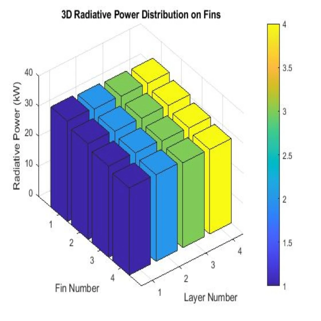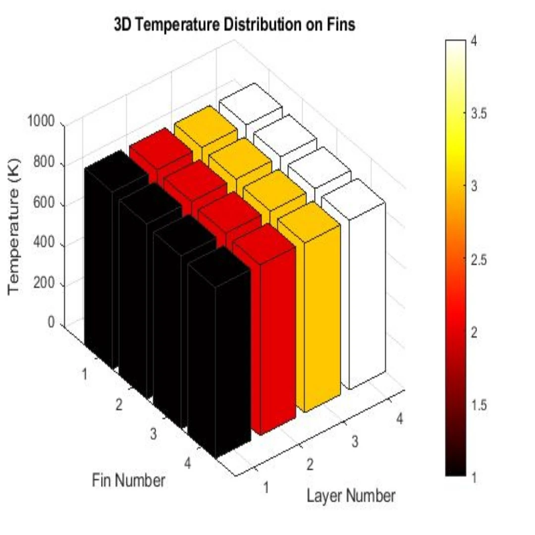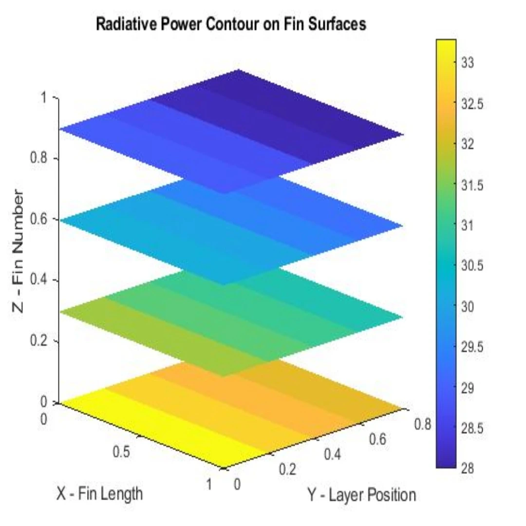 تشعشع و هدایت حرارتی ناپایدار 4 فین 4 لایه در متلب تحلیل و بررسی شد. کانتور دما و کانتور توان تشعشعی آن برحسب لایهها قابل مشاهده است.