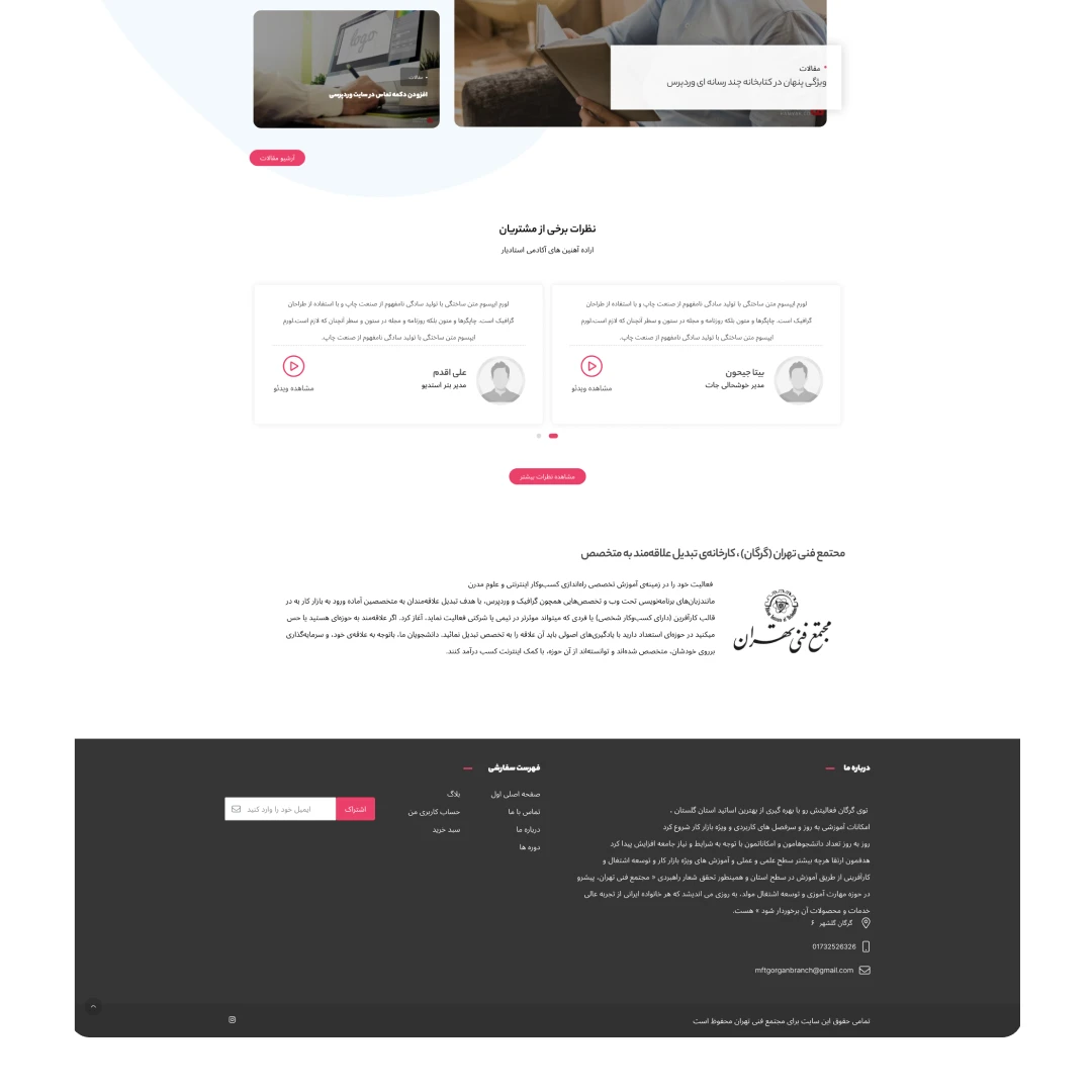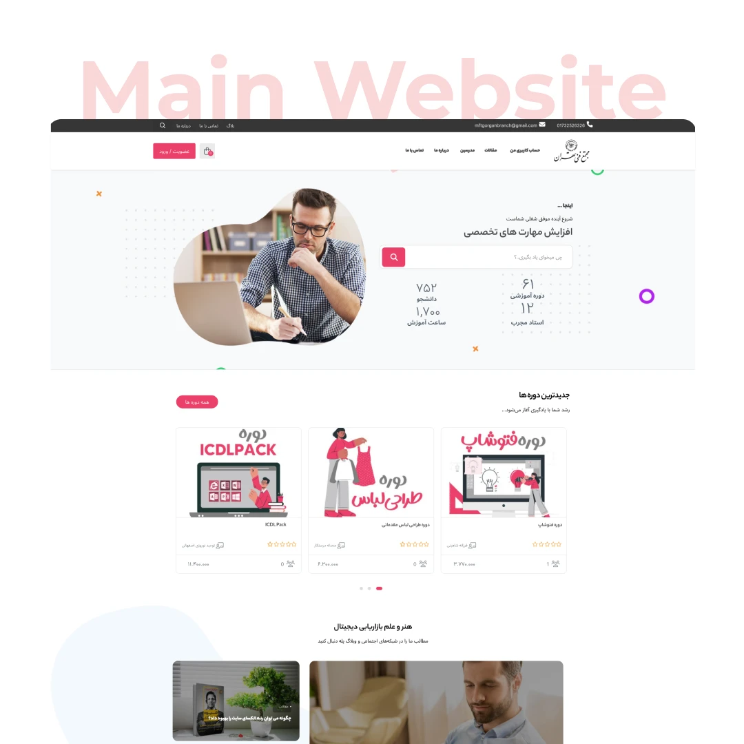 فروش و ثبت نام دوره های حضوری و مجازی به کمک این سایت اتفاق می افته که توی این سایت فرم های ثبت نام زیادی استفاده کردیم و بخش هایی از فروش فایل و صفحه اصلی و بخش مربوط به داده ها کدنویسی شده است