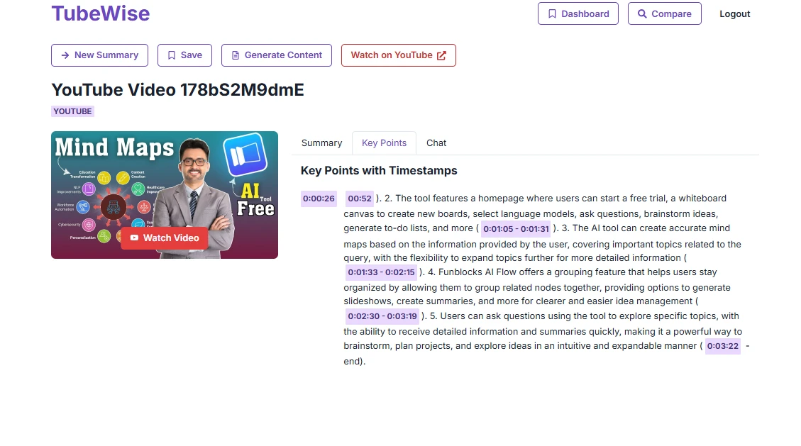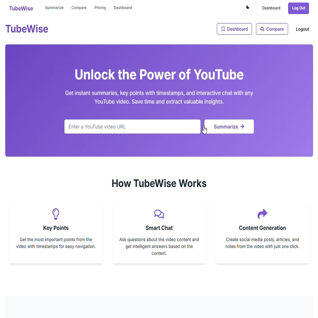 TubeWise is a YouTube learning and content generation web application with a companion Chrome extension. It helps users quickly digest video content and generate new content from it.