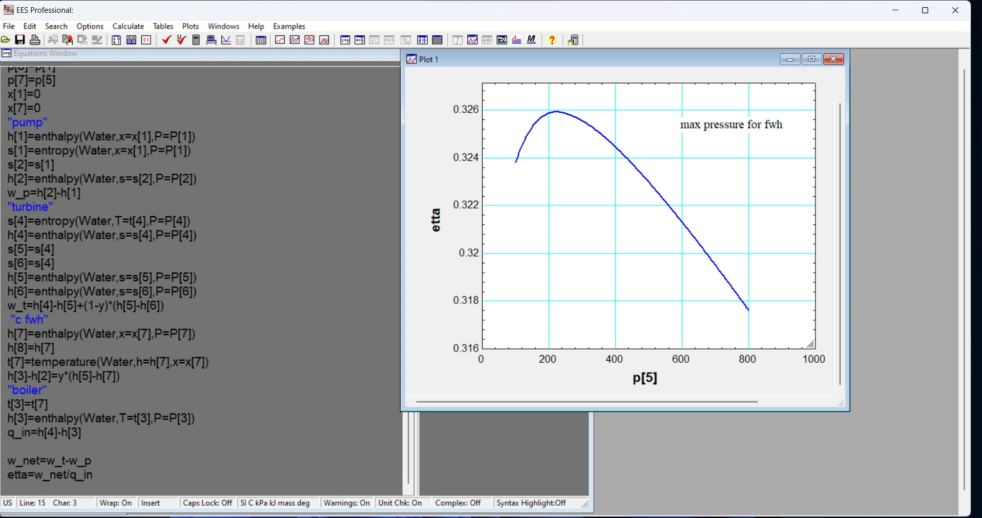 در سیکل رانکین بررسی شد در چه فشار خروجی از توربین یا همان bleed pressure برای گرمکن آب تغذیه بهترین بازده سیکل بدست می آید.