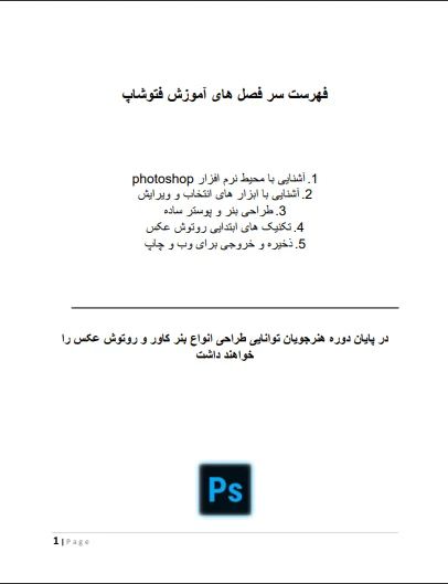 این بروشور به عنوان یک پروژه نمونه و تمرینی با استفاده از Microsoft Word طراحی شده است. موضوع بروشور، معرفی دوره های آموزش فتوشاپ در یک آموزشگاه فرضی است.