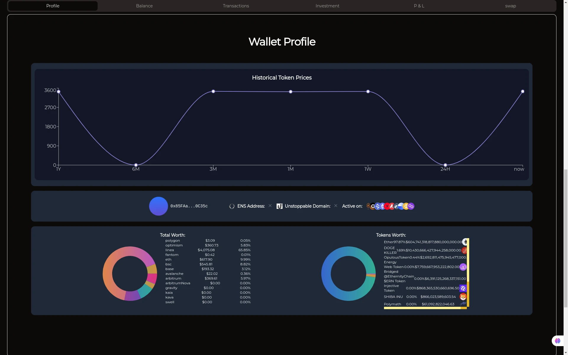 در این تصویر سه چارت را میبینید که چارت اولی به نمایش کامل ارزش کیف پول کاربر در بازه های زمانی مختلف میپردازد و دو چارت زیر به بررسی توکنها مقدار و ارزش یک کیف پول روی بلاکچین های مختلف پرداخته است