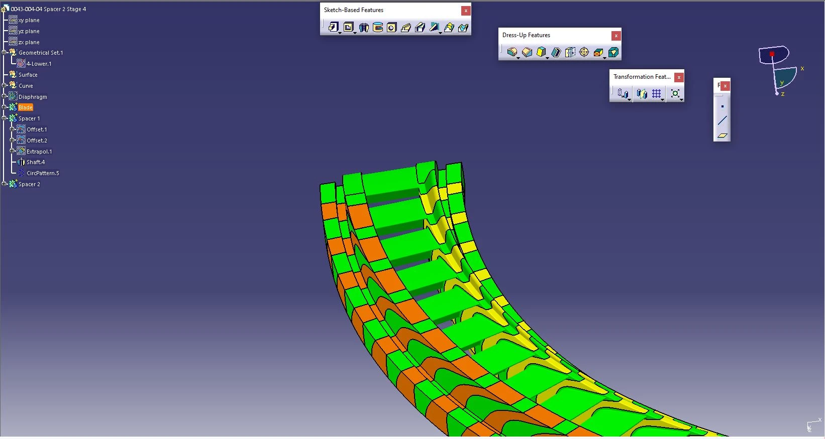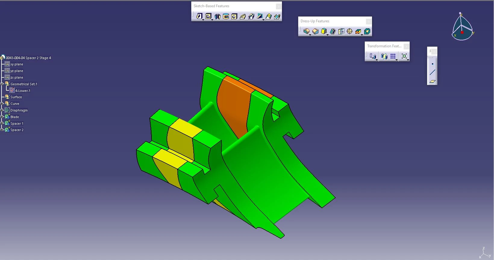 در این پروژه، بخش دیافراگم توربین بخار شامل پرههای ثابت، اسپیسِرها و رینگ نگهدارنده در نرمافزار CATIA طراحی و مونتاژ شد.