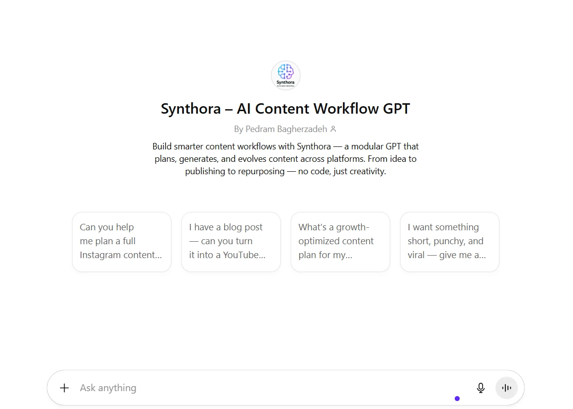 Synthora یک هوش مصنوعی و ابزاری هوشمند برای طراحی گردشکار تولید محتواست که از ایدهپردازی تا زمانبندی انتشار را پوشش میدهد. این GPT برای بلاگرها، تیمهای محتوا و بازاریابی طراحی شده و شامل بخشهایی مانند Idea Generator، Content Calendar، Storyline Builder و Auto-Optimizer است.