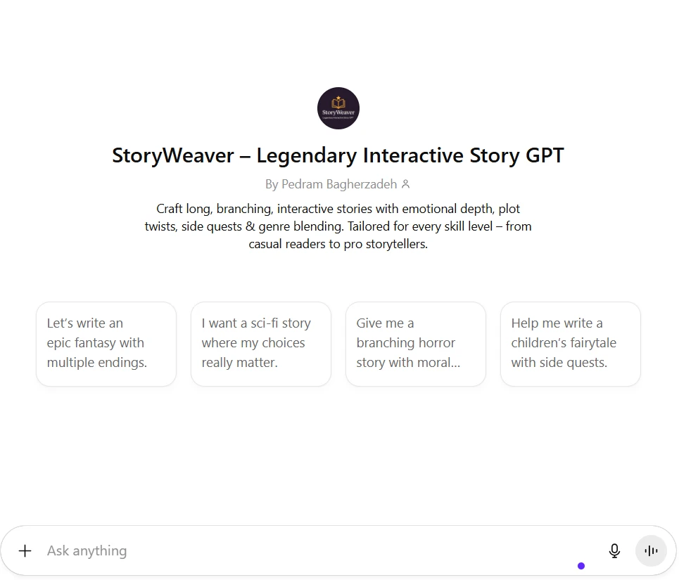 StoryWeaver یک GPT پیشرفته در ژانر داستاننویسی تعاملی است که به کاربر اجازه میدهد با انتخاب مسیرهای مختلف، یک داستان چندشاخه خلق کند. این GPT از سیستم "Memory Threading" برای یادآوری انتخابهای قبلی، و "Multi-ending Mode" برای تولید پایانهای مختلف استفاده میکند. کاربرد آن در تولید رمان، آموزش تعاملی و سرگرمی حرفهای است.