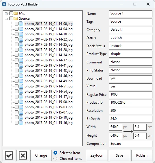 نرم افزار Fotojoo Post Builder به سفارش شرکت نرمافزاری زیتون برای مدیریت تصاویر موجود بر روی یک سایت فروش عکس و پست کردن آنها در پنل وردپرس است که توسط زبان برنامهنویسی سی شارپ تهیه شده است. این برنامه امکان تعیین دستهبندی، وضعیت انتشار، وضعیت فروش، نوع محصول، امکان کامنتگذاری، وضعیت پینگ، قابلیت دانلود، مجازی بودن، قیمت محصول، آیدی محصول، نام، تگها، ابعاد پیش نمایش و ... را دارد. همچنین قابلیت اجرا بدون کوچکترین مشکل بر روی تمام ویندوزها تا به امروز (ویندوز 11) را داشته و برای اجرا نیاز به هیچ دسترسی خاصی (ادمین) ندارد.