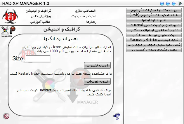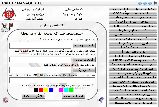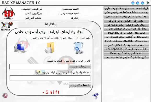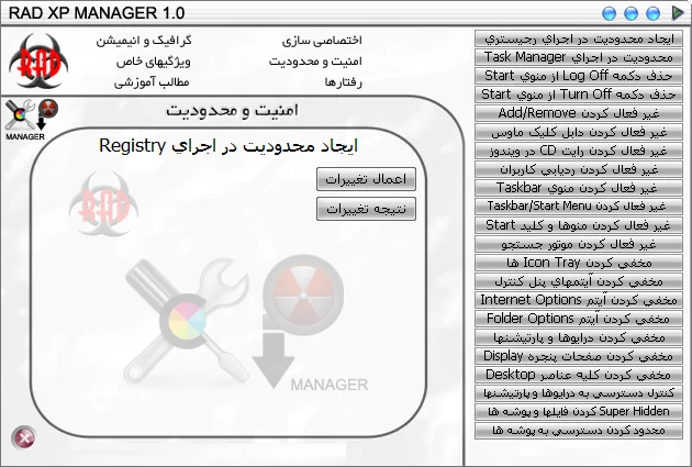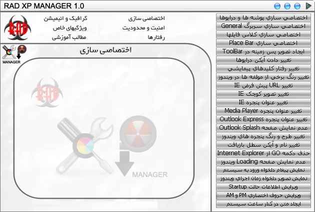 نرم افزار Rad XP Manager ابزاری قدرتمند برای مدیریت کامل ویندوز XP و سفارشیسازی آن با امکانات جامع و قابلیتهای متنوع است که توسط زبان برنامهنویسی سی شارپ تهیه شده است. این برنامه امکانات بسیار زیادی را در یک محیط یکپارچه جای داده و نکته جالب در مورد آن این است که حداقل نیمی از قابلیتهای آن بر روی ویندوزهای جدید مانند ویندوز 10 و 11 نیز کار میکند.
