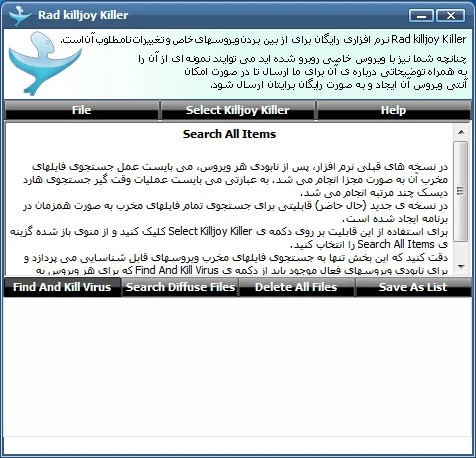 نرم افزار Rad Killjoy Killer نرم افزاری خاص و بینظیر است برای شناسایی و از بین بردن برخی از ویروسهای خاص است که توسط زبان برنامهنویسی سی شارپ تهیه شده است. البته این برنامه فاقد سیستم دفاعی است و تقریبا پس از آلوده شدن سیستم به ویروس و برای شناسایی و پاکسازی ویروس، جستجو و حذف فایلهای تکثیر شده و رفع اشکالات ایجاد شده در سیستم قابل استفاده است. همچنین دارای قابلیت شناسایی فایلهای مشکوک به آلودگی، ایجاد لایههای امنیتی بر روی پارتیشنهای هارد، رفع محدودیتهای ایجاد شده بر روی سیستم توسط ویروسها، استارتآپ و گزارش پروسههای مشکوک به کاربر و مسدوسازی آنها در صورت نیاز، اسکن نقاط بحرانی سیستم و معرفی فایلهای مشکوک است. علاوه بر آن دارای یک مرورگر فایل داخلی برای مشاهده و جستجوی فایلهای مخفی و مدیریت آنها است.