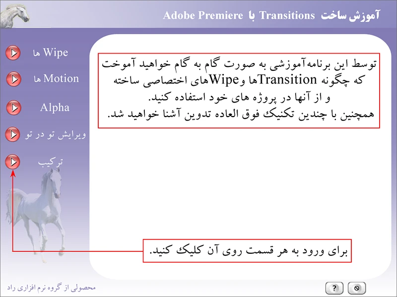 توسط این محصول آموزشی شیوه ساخت ترانزیشنهای اختصاصی و دلخواه را در محیطی کاملا شبیهسازی شده خواهید آموخت. شیوه اموزشی این مجموعه Interactive است، به عبارت دیگر تمام مراحل آموزش (حدود 10 ساعت آموزش)توسط خود کاربر انجام می شود. این برنامه آموزشی توسط نرم افزار دموشیلد ساخته شده است.
