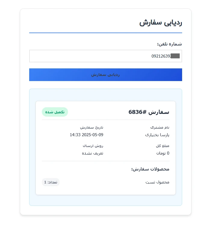 این افزونه امکان بسیار کاربردی برای فروشگاههای اینترنتی فراهم میکند: مشتریان شما میتوانند تنها با وارد کردن شماره تلفنی که هنگام ثبت سفارش استفاده کردهاند، وضعیت سفارش خود را در سایت مشاهده و پیگیری کنند.