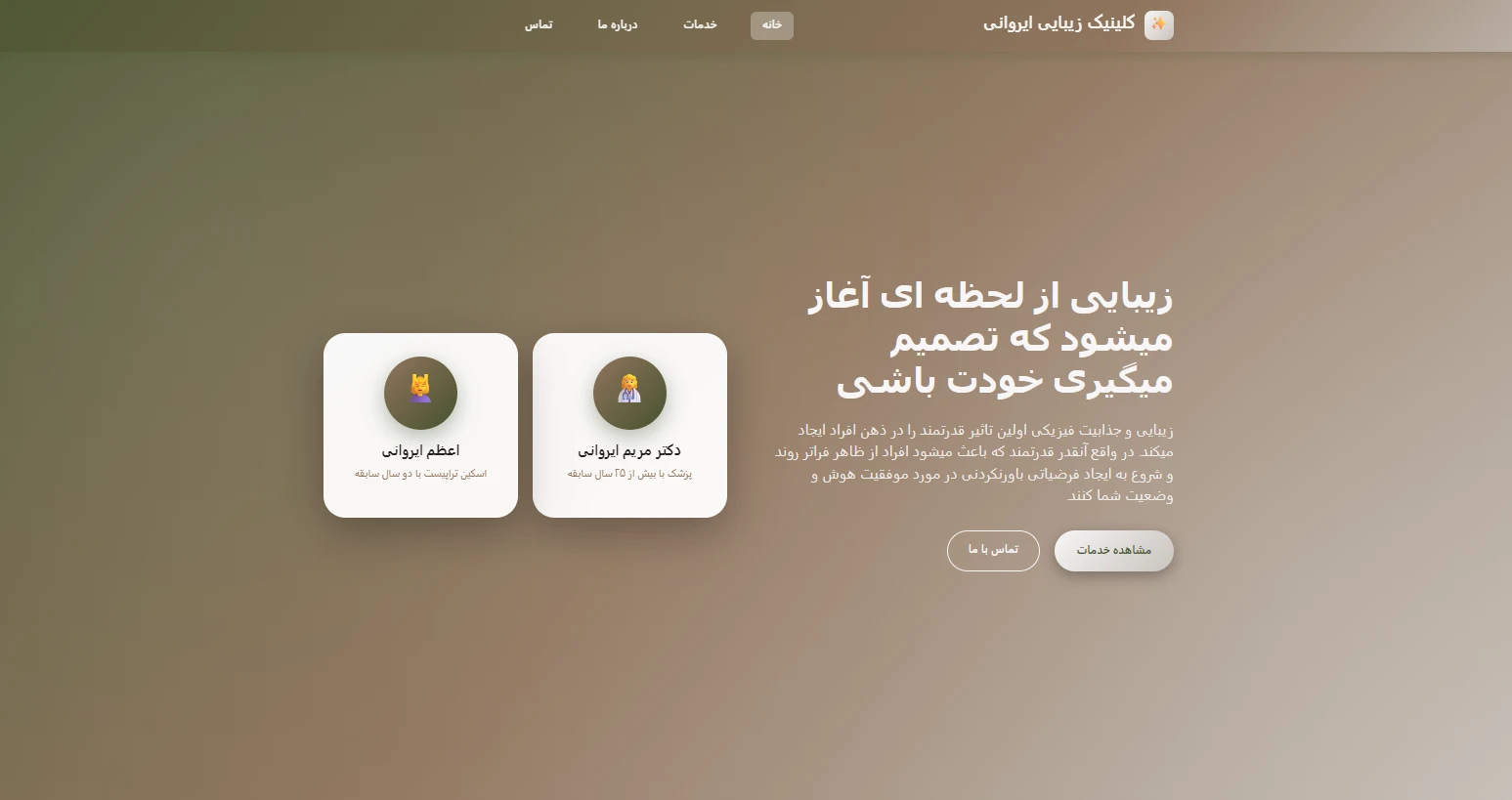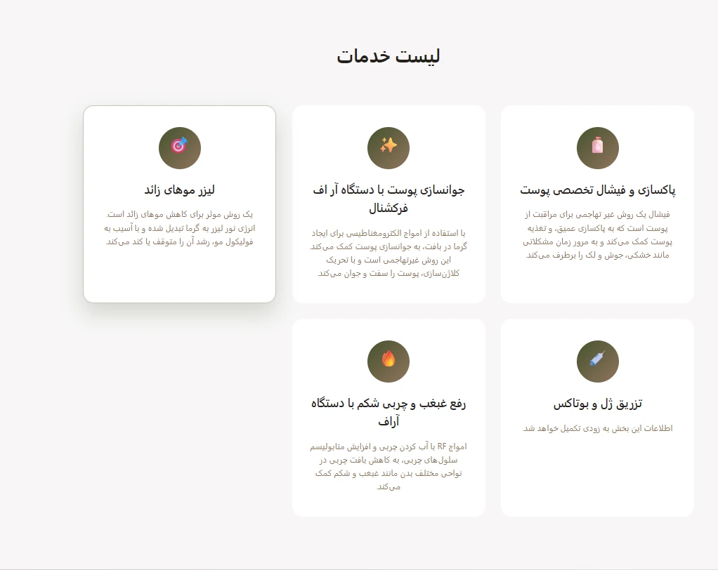قالب تخصصی وردپرس برای کلینیکهای زیبایی با طراحی مدرن و حرفهای. این پروژه شامل طراحی کاملاً ریسپانسیو با پشتیبانی از زبان فارسی و راست به چپ است. قالب دارای بخشهای جداگانه برای معرفی خدمات، تیم پزشکی، و اطلاعات تماس میباشد.