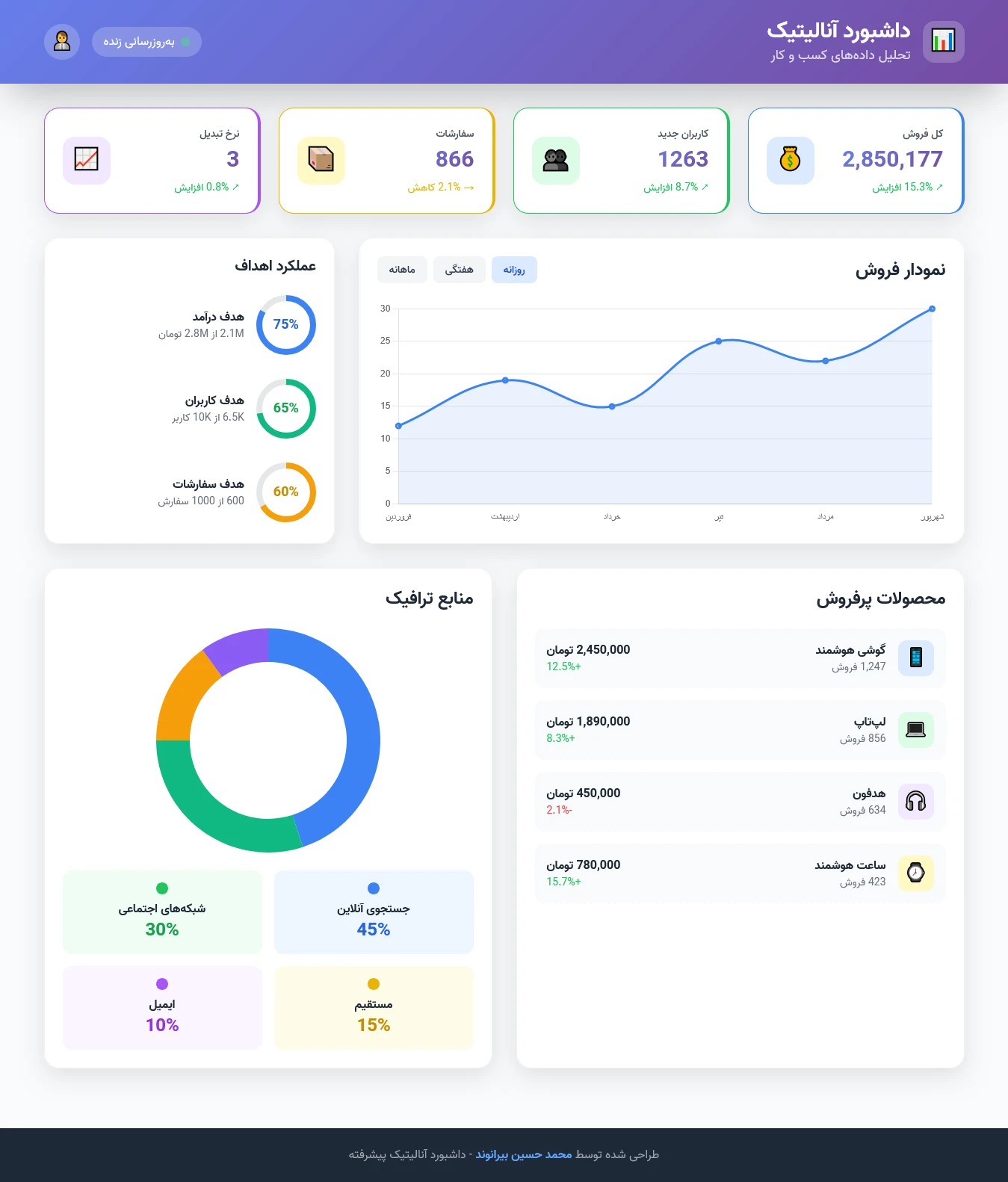 «داشبورد تحلیلی پیشرفته ساخته شده با React، Tailwind و سهقلوها؛ نمایش دادهها بهصورت دقیق و زیبا برای تصمیمگیری سریع و هوشمند.»