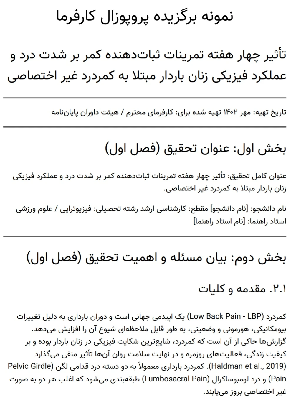 نمونه پروپوزال تاثیر چهار هفته تمرینات ثبات دهنده کمر بر شدت درد و عملکرد فیزیکی زنان باردار مبتلا به کمر درد غیر اختصاصی