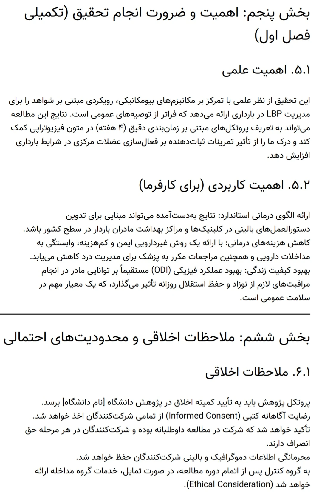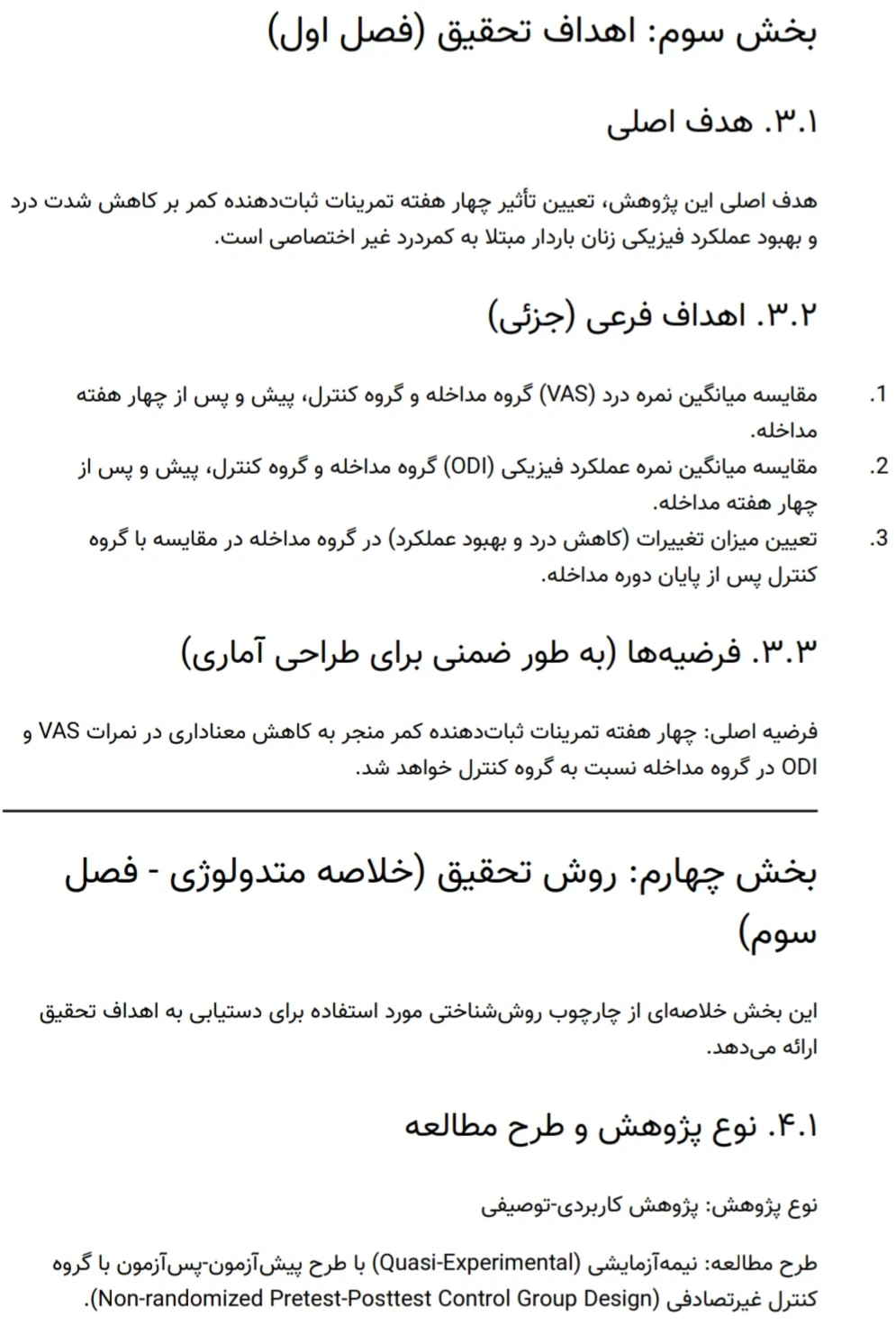 این پروژه بخشی از پایاننامه کارشناسی ارشد در حوزه توانبخشی ورزشی است که به بررسی اثرات تمرینات ثباتدهنده مرکزی بر کاهش شدت درد و بهبود عملکرد فیزیکی زنان باردار مبتلا به کمردرد غیر اختصاصی میپردازد. طراحی تحقیق بهصورت نیمهتجربی بوده و شامل نگارش فصلهای تحقیق، تحلیل آماری دادهها، و بحث علمی درباره مکانیسمهای تأثیرگذار تمرینات ثبات بر عضلات مرکزی و وضعیت عملکردی در دوران بارداری است.