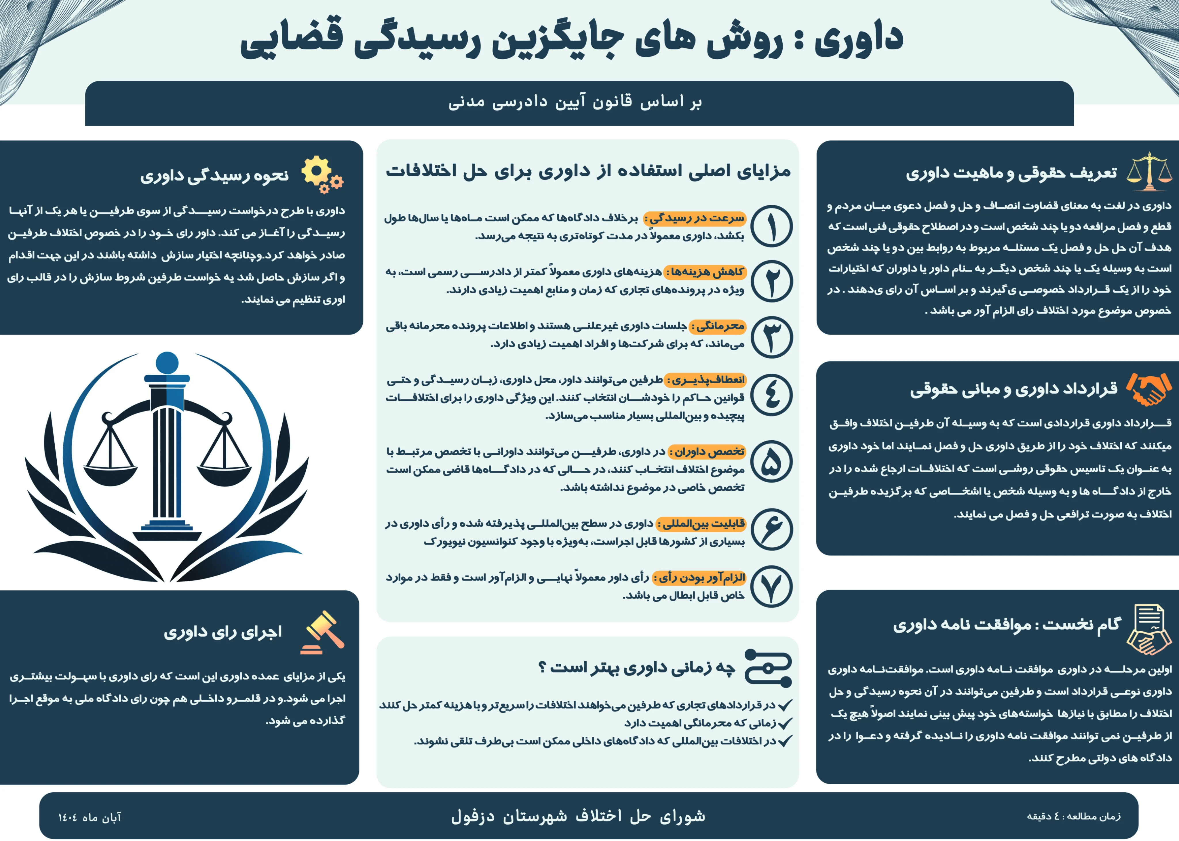 یک اینفوگرافیک با عنوان معرفی داوری در شورای حل اختلاف شهرستانها تسط هنر و ایده پردازی گرافیکی با استفاده از فتوشاپ تهیه شده.
