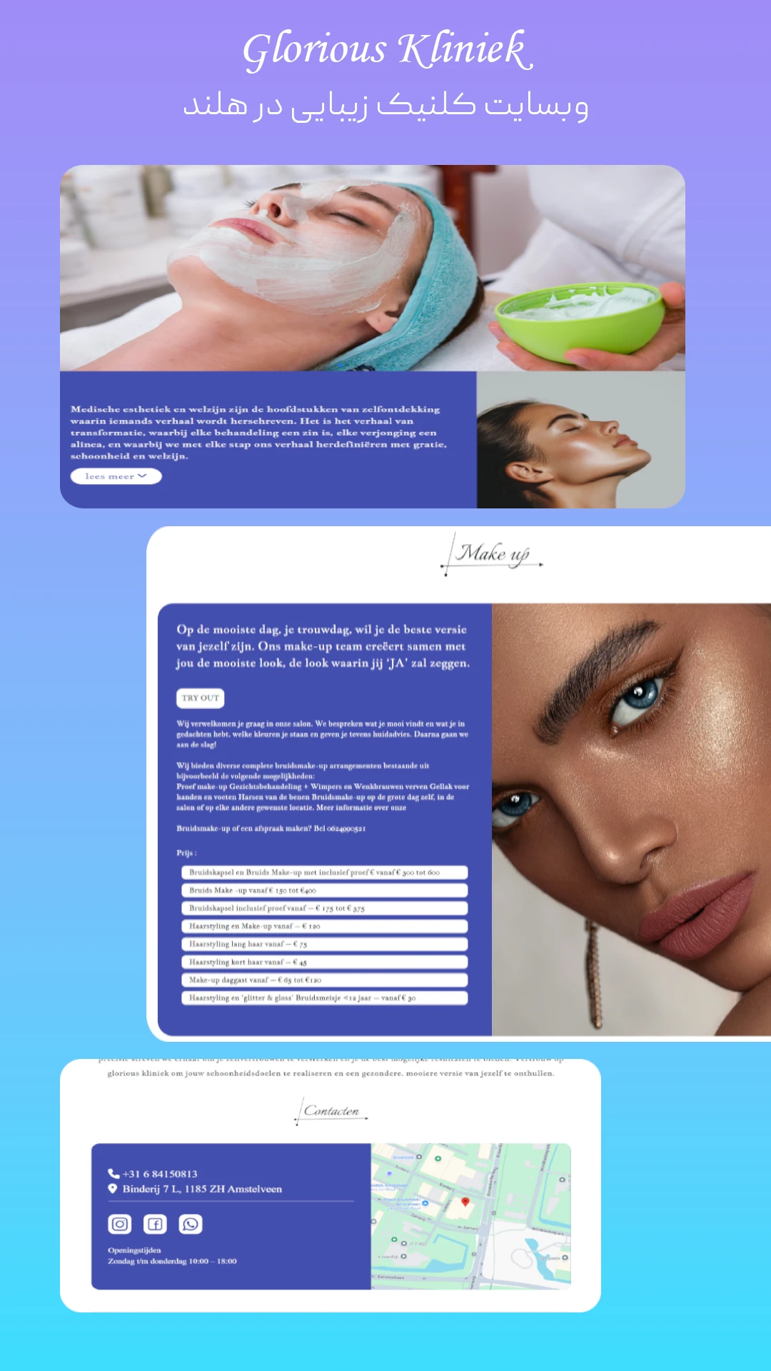 برای کارفرمای خارجی ساکن هلند که مدیر یک کلینیک زیبایی پوست بودند این کار رو طراحی کردیم، با طراحی مینیمال و رنگ های جذابی که استفاده شده جلوه خیلی خوبی رو به قالب وبسایت داده، همچنین سیستم رزرو آنلایم تایم هم در این وبسایت وجود داره