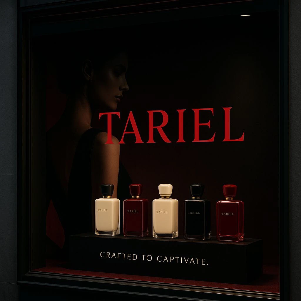 لوگوی TARIEL که با ابزارهای هوش مصنوعی خلق شده است با الهام از ذات زنانهی قدرتمند و ظرافت درون آن طراحی شد؛ ترکیب خطوط مینیمال و فونت کلاسیک با رنگهای مشکی و قرمز چری، حس لوکس و افسونگر برند را تداعی میکند. درخشش طلایی حروف، نمادی از اعتمادبهنفس و شکوه درونی زنی است که TARIEL برای او خلق شده است.