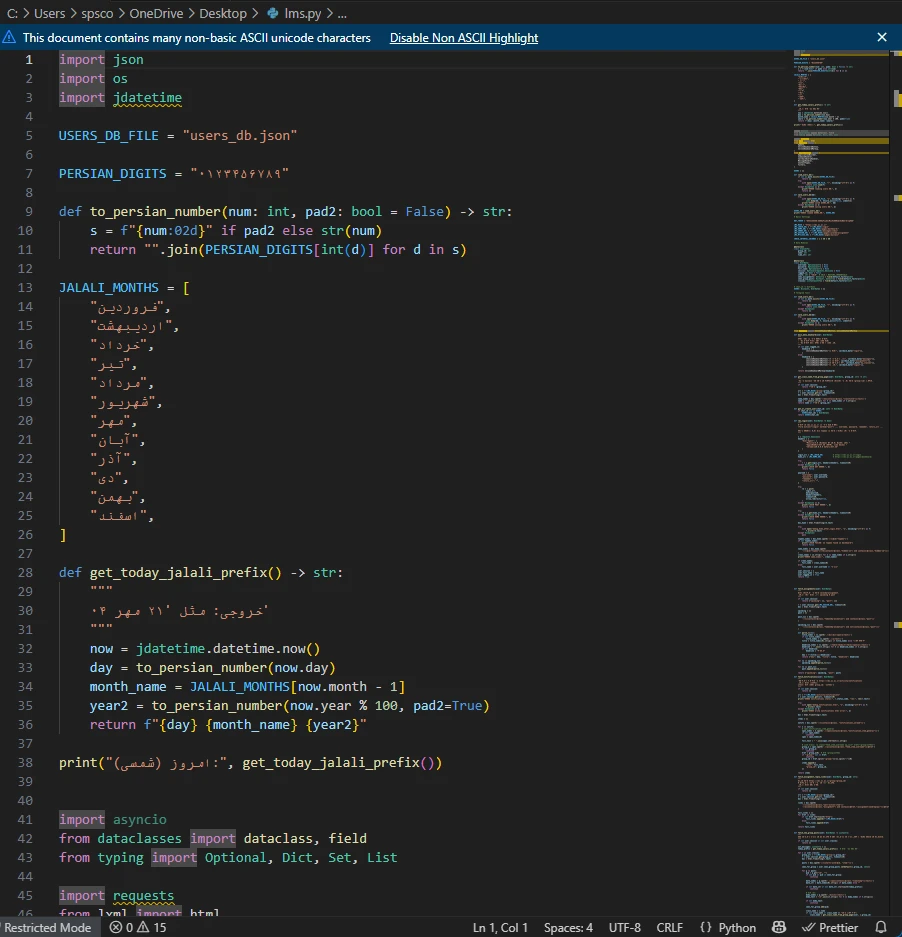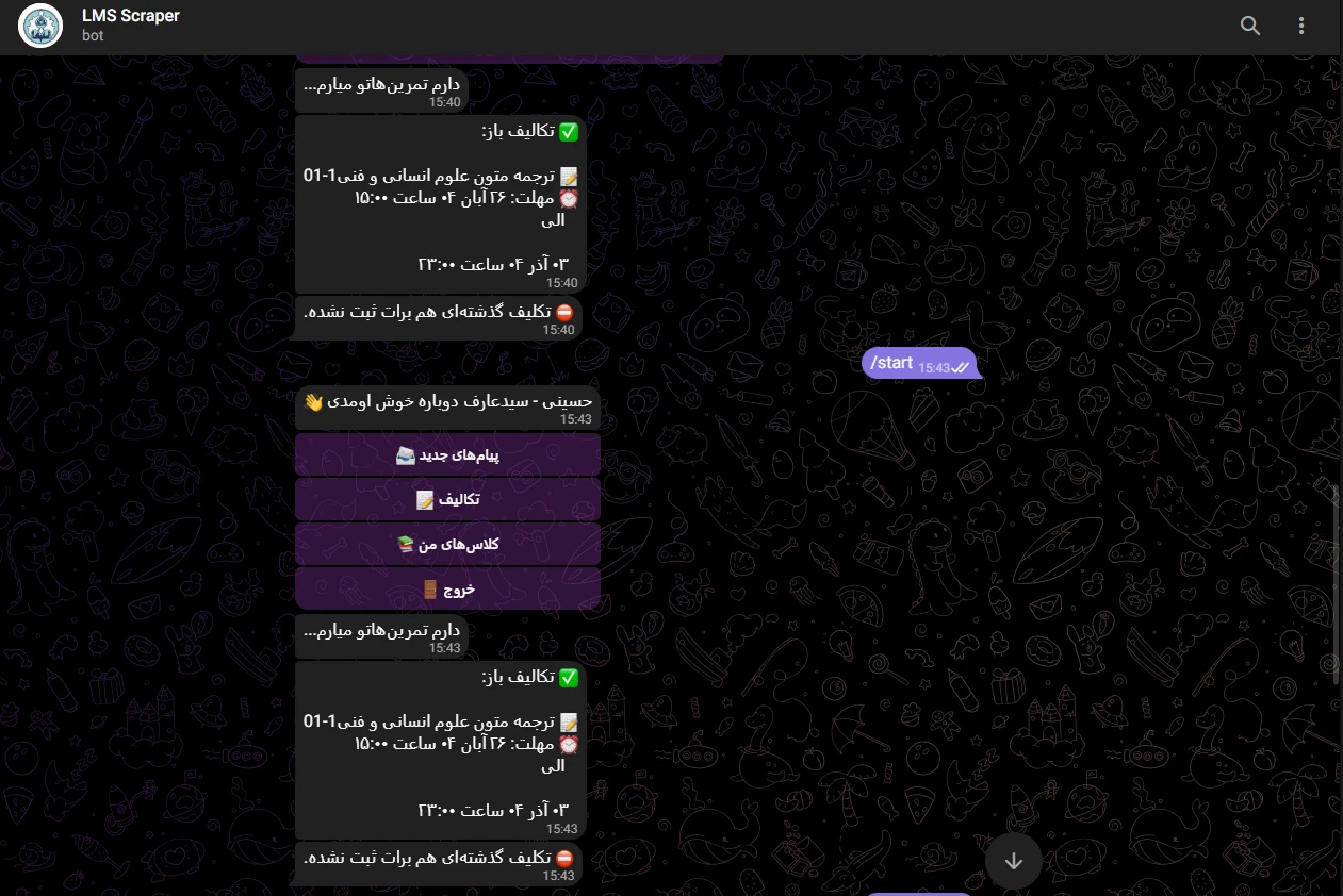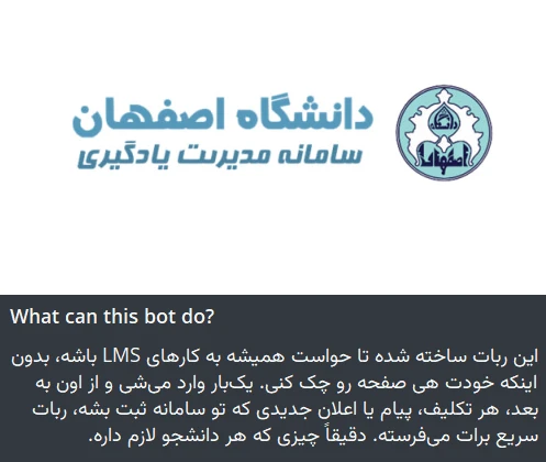 یک ربات تلگرام اختصاصی برای اتصال مستقیم به سامانه LMS دانشگاه اصفهان. این ربات بدون استفاده از مرورگر و با درخواستهای HTTP کار میکند و امکان ورود خودکار، دریافت تکالیف، اعلانها و پیامهای کلاسی را فراهم میسازد. دادهها به صورت دورهای بررسی و به تلگرام ارسال میشوند. ساختار پروژه پایدار، سریع و قابل توسعه است و برای اتوماسیون آموزشی و دانشگاهی کاربرد دارد.