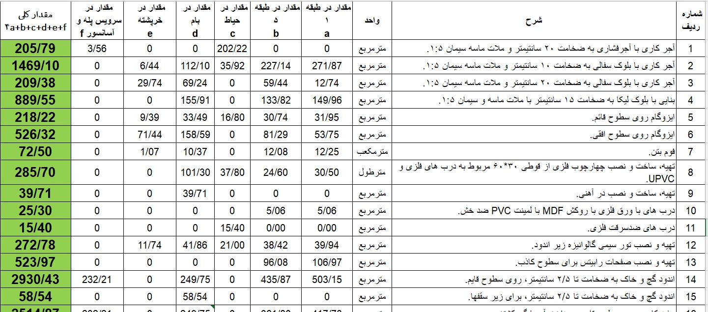 تمامی متره ها بر اساس نقشه ها انجام شد و با آدرس دهی کامل با نقشه به صورت پکیج به کارفرما ارائه شد همچنین علاوه بر آن یک فایل خلاصه متره جهت گزارش مدیریتی برای آنها تهیه گردید.