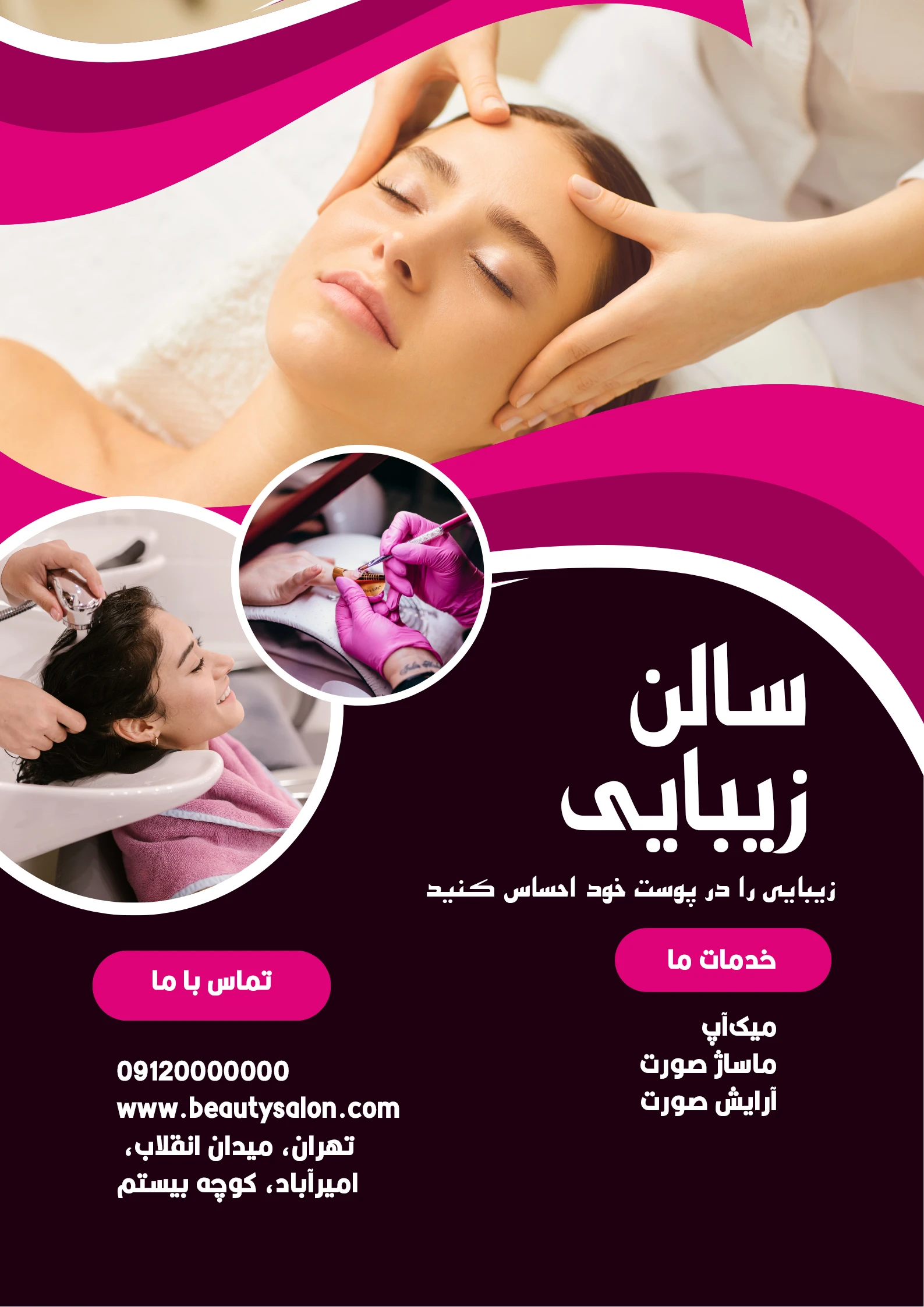 پوستری که ملاحظه میفرمایید مربوط به یک سالن زیبایی است. در این پوستر متنها، فونتها، تصاویر، رنگها و ... با توجه به درخواست شما تغییر داده میشود.