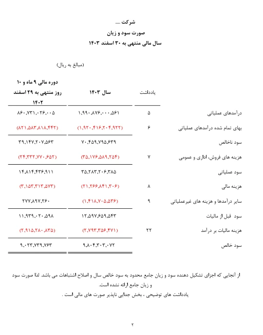 من صورتهای مالی یک شرکت بازرگانی را به صورت کامل و مطابق با آخرین استانداردهای حسابداری ایران تهیه کردهام. این نمونه، گزارش سود و زیان منتهی به تاریخ ۱۴۰۴/۱۲/۳۰ است که دقت محاسباتی و تسلط کامل من بر تحلیلهای مالی و انطباق با قوانین مالیاتی را نشان میدهد.