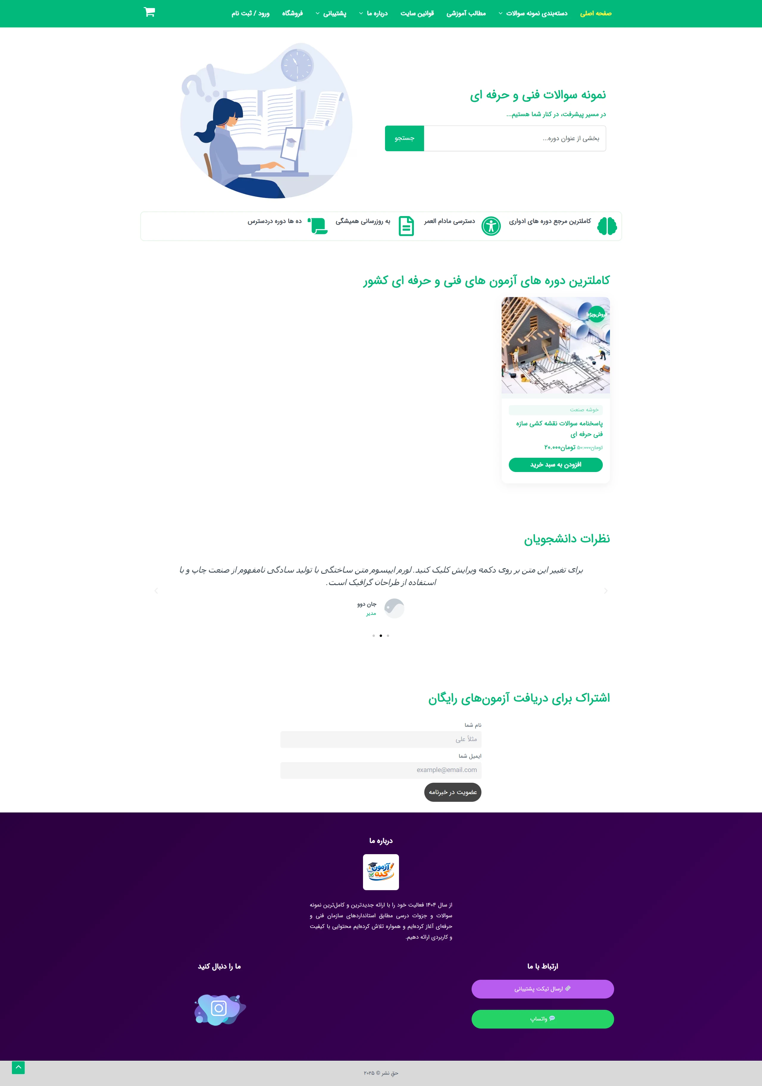 هدف کارفرما ایجاد بستری متمرکز برای دسترسی آسان هنرجویان و داوطلبان به نمونه سوالات، آزمونهای تمرینی و فایلهای آموزشی قابل دانلود بود.