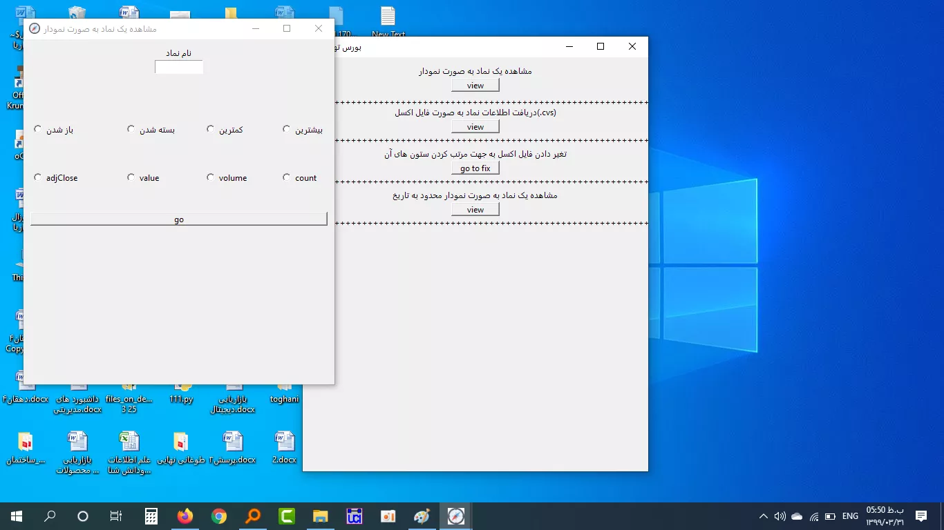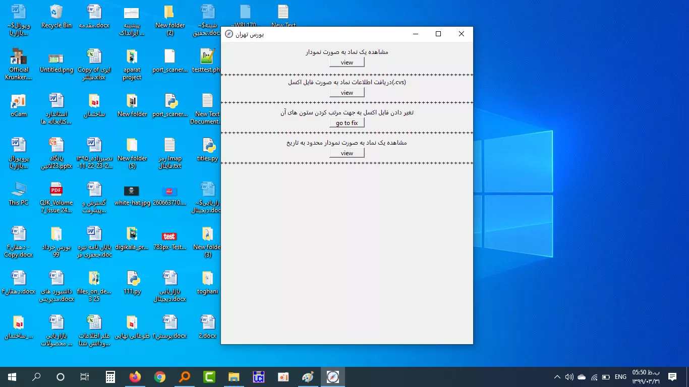 نرم افزار برسی بورس به زبان پایتون. در این نرم افزار میتوان به طور کامل تمامی نماد هارا مشاهده کرد. از قابلیت های این نرم افزار میتوان به دریافت نام تمامی نماد ها به صورت فایل csv و نمایش آنها به صورت یک نمودار ستونی میباشد.امکانات بیشتردرآپدیتای بعد